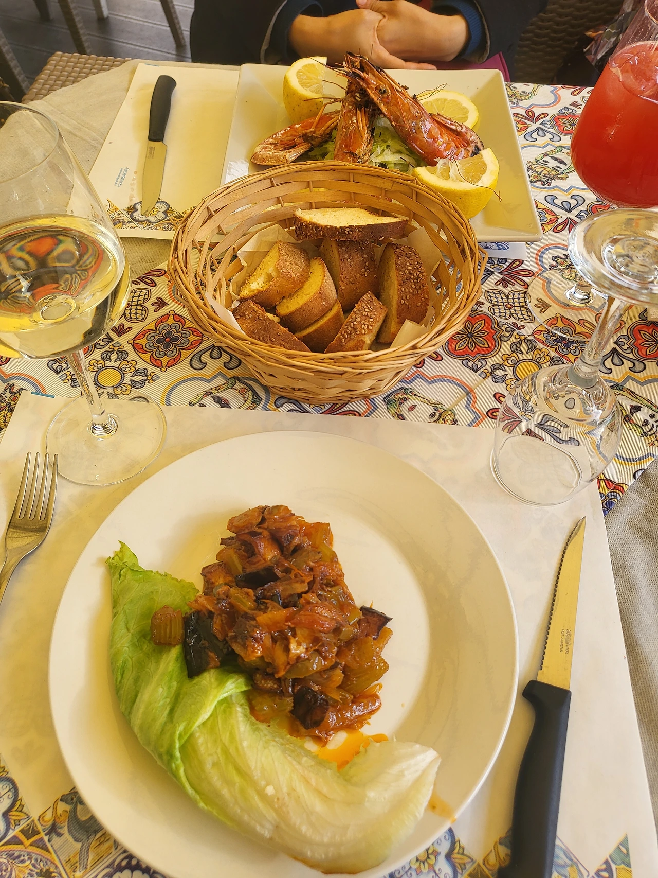 몬레알레에서 바라본 팔레르모는 고요하고 예뻤다. 몬레알레 대성당은 내부 수도원 정원도 유명하고 그곳에서 바라보는 팔레르모의 풍경도 아름답다고 한다. 그러나 내가 몬레알레 대성당을 찾은 이유는 이 성당에 있는 거대한 모자이크화를 보기 위해서였다. 점심 휴식 시간이라 오후 두 시 반에 성당 문이 열리기 때문에 부근에서 점심 식사를 한다. 성당 측면이 보이는 레스토랑에서 시칠리아식 가지 요리인 카포나타와 왕새우 구이에 스프리츠 아페롤, 그리고 화이트 와인. 스프리츠 아페롤의 색깔이 무엇보다 아름답다.