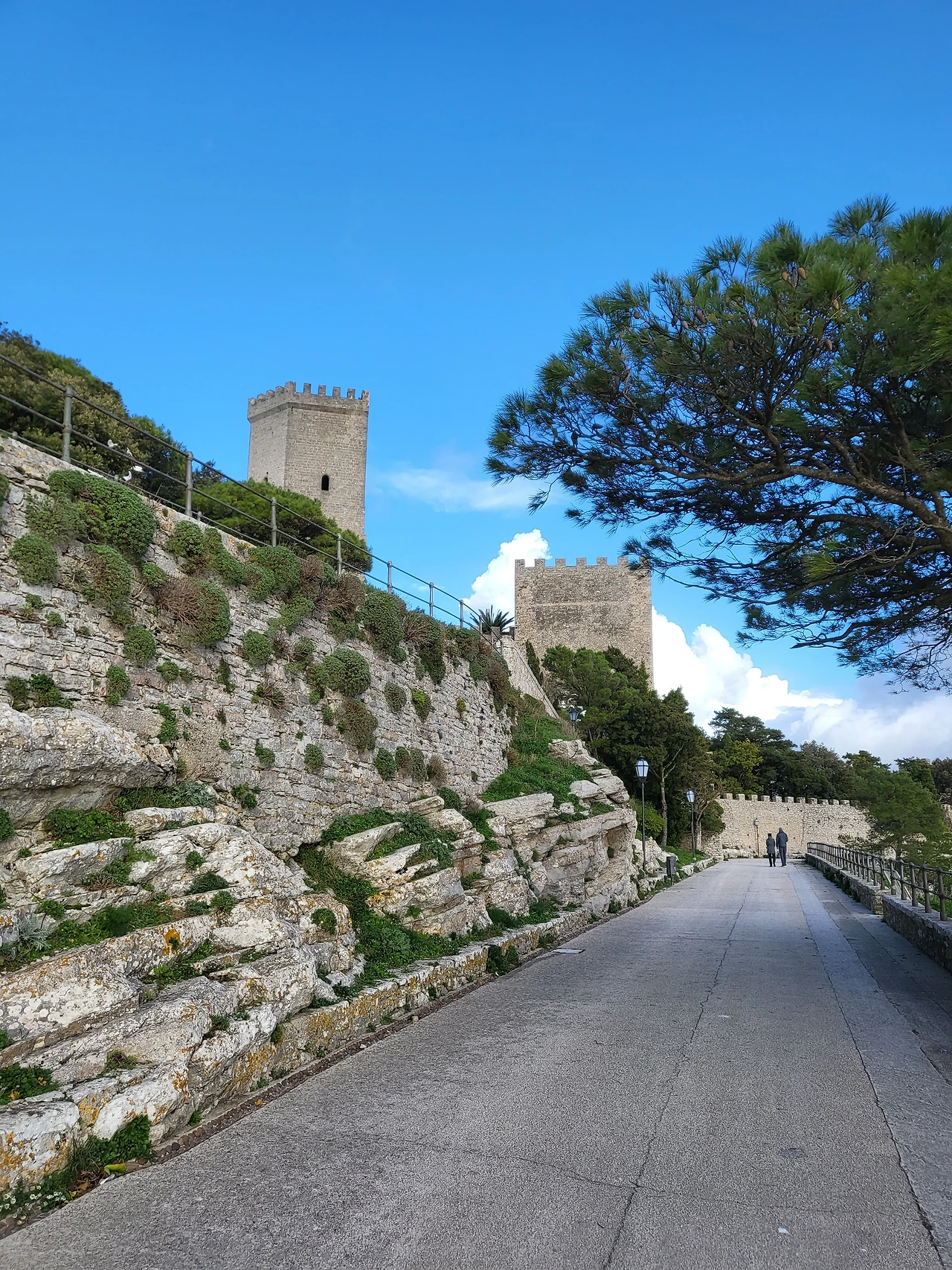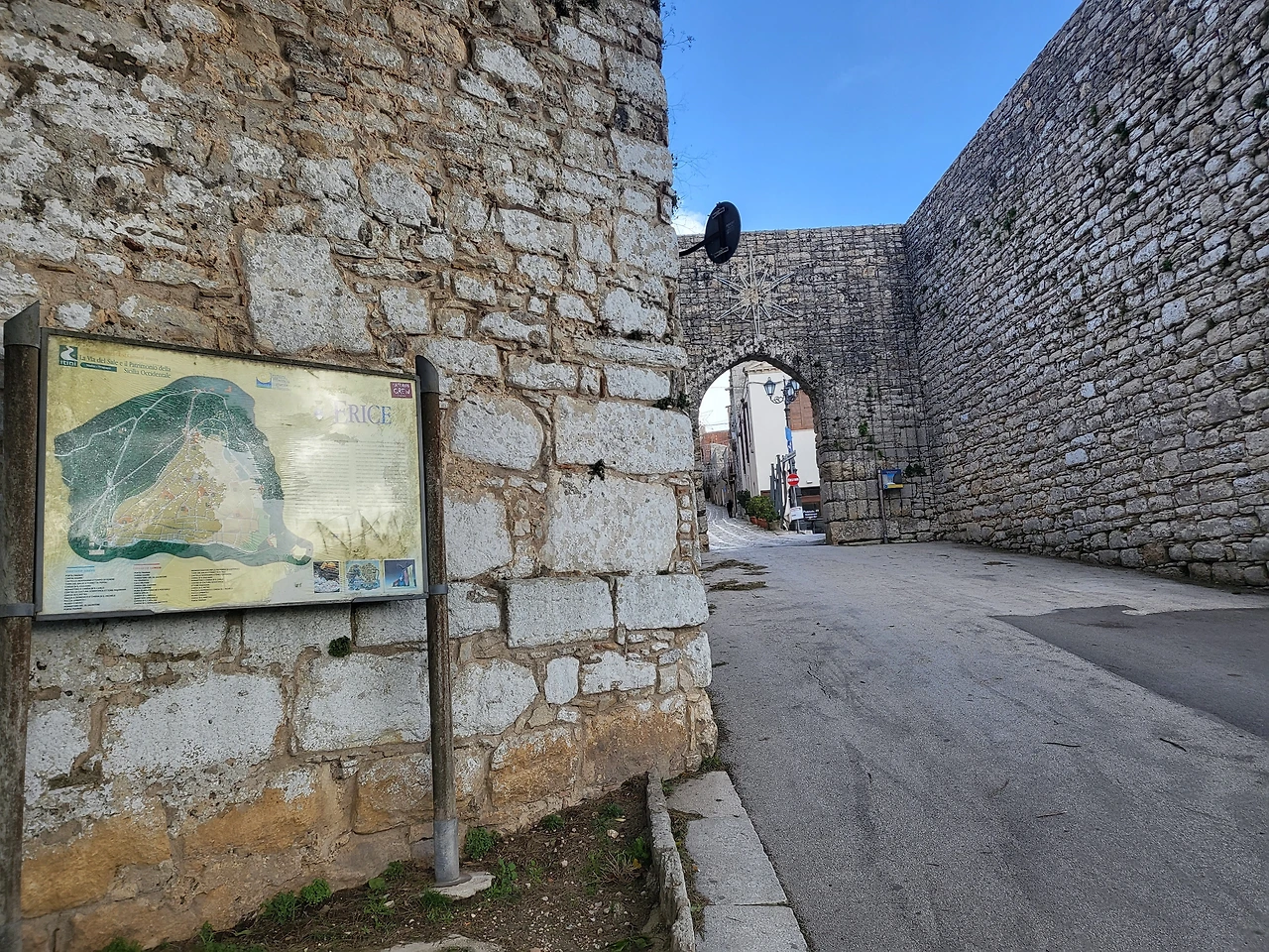 바람 소리를 들으며 두 시간 여를 오른 산길, 이제 조금 떨어진 곳에 도로가 보인다. 트라파니 케이블카 역 부근에서부터 에리체까지 올라오는 구불구불한 산길이다. 저 도로를 가로질러 조금만 올라가면 에리체에 도착한다. 더 이상 산길이 아닌 포장도로를 걸어 올라갔다. 조금 올라가니 에리체 케이블카 역이 보이고 널따란 주차장이 보인다. 주차장에서 도시로 들어가는 문 앞에 관광안내소가 있다. 이곳에서 지도를 받아 들고 간단한 설명을 들은 후에 산 위의 이 도시로 들어간다.