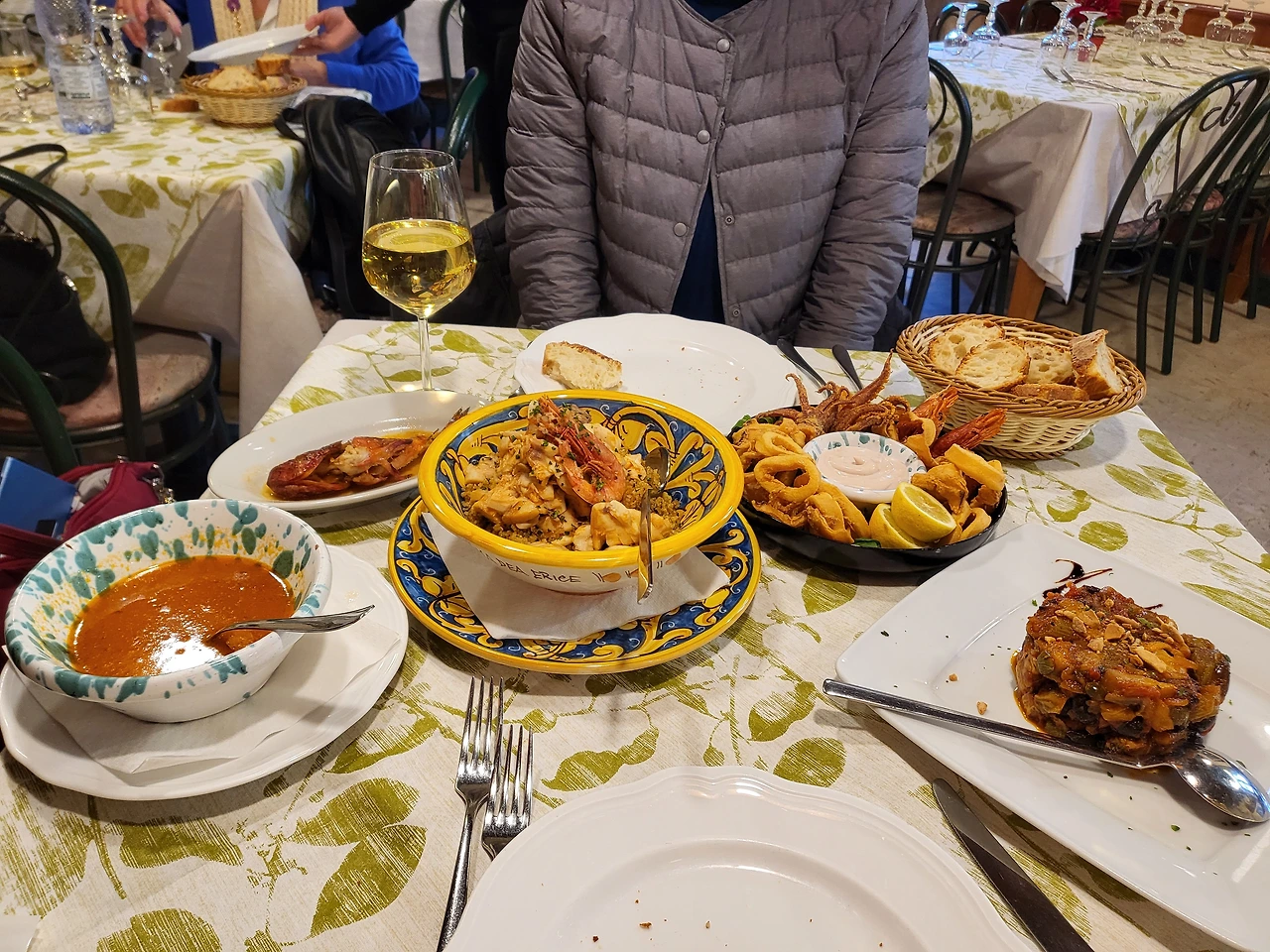 두 시간의 산행으로 인해 배가 고프다. 사람들이 많이 들어가는 식당으로 들어가 음식을 주문했다. 쿠스쿠스와 카포나타, 오징어 튀김과 화이트 와인. 생각보다 양이 많아서 좀 남기긴 했지만 음식은 적절히 맛있었고 하우스 와인도 나쁘지 않았다.