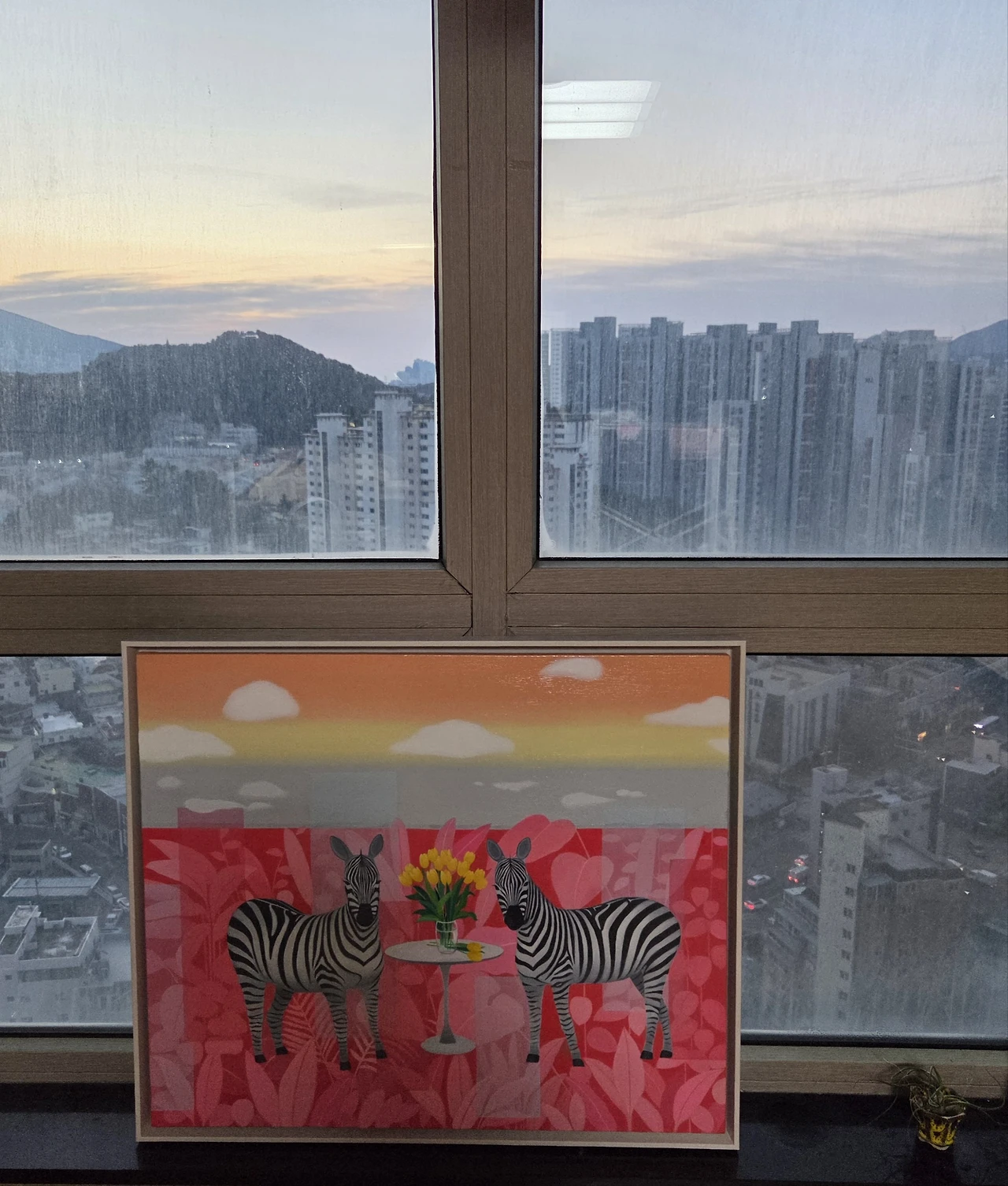 아침에 일어나면 나의 루틴이 있다. 미니 싱잉볼로 모든 에너지를 모아 내가 정말 좋아하는 그림들을 감상하는 것이다. 나에게 아침 10분은 소중한 힐링 시간이다. 늦게 일어나는 아침에도 그림을 볼 시간 1분 정도는 반드시 지킨다. 그래야 나의 하루 에너지를 끌어올려서 충만한 아침을 맞을 수 있기 때문이다. 그림을 배운 지 7년 넘은 글로벌 동기에게 이 소중한 그림을 샀다. 우연히 그녀의 프로필에 있는 그림을 보고 내가 먼저 작업을 했다. " 다현아, 너 혹시 이 그림 뭐야? " 그녀는 말했다. "언니 제가 그린 그림인데요, 개인전을 한 작품이에요" 이 말을 듣는 순간 나는 감탄, 감동한 몸짓으로 화답을 했다. "와우, 정말 대단하다. 이게 너 작품이라고? 정말 멋있다. 색감 조화가 너무 아름다워" 난 그녀의 대답을 듣기도 전에 말했다. "다현아 이 그림 내가 사면 안 될까?" 그녀의 표정을 잊을 수가 없다. 어리둥절한 표정으로 "제 그림을 사신다고요?" 한 번도 제안받아보지 못해서 더 어색한 눈빛이다. 나는 강하게 더 어필했다. " 다현아 이 두 그림 내가 다 사고 싶어" 그녀가 그린 그림은 한 쌍처럼 두 개의 그림이 나란히 있었다.