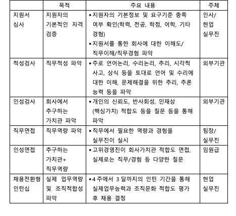 수시채용에 따라 회사마다 채용절차가 대동소이해 보이나 실제로는 많은 차이가 나고 있다. 따라서, 회사에서 사람을 채용하는 절차에 대한 전체 시각을 가지고 있는 것과 그렇지 않은 경우는 대응역량에서 많은 차이가 발생할 수 있다. 또한 유사해 보이는 채용프로세스인 것 같지만 실제로 회사의 채용철학에 많은 차이가 있는 경우를 볼 수 있다.