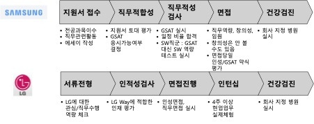 다음은 우리나라의 대표적인 기업인 삼성과 LG의 채용프로세스이다. 두 회사 모두 큰 차이가 없어 보이나, 실제로는 많은 차이가 나타난다. 삼성의 경우는 직무적합성, 직무적성 검사가 강화되어 있어 보다 직무중심적, 업무중심적이라는 것이 드러나 보인다. 또한 직무적성 검사가 실질적인 당락에 매우 크게 영향을 주기 때문에 GSAT에 대한 상당한 준비가 필요하다.