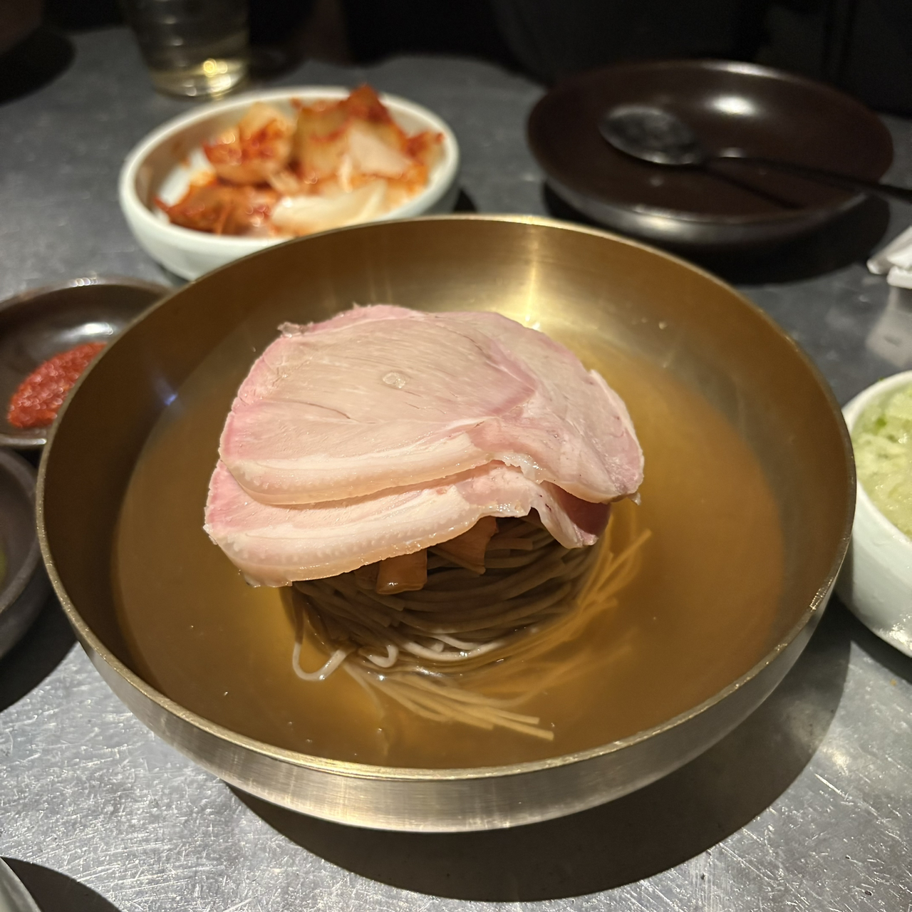 평양냉면에는 차가운 얼음도, 매운 양념도 들어가지 않는다. 식감이 수더분하고 고소한 반면 질감이 다소 거친 탓에 메밀 고유의 질감이 그대로 느껴지는 맛. 국물을 한 숟갈 떠먹으면, 동치미의 새콤한 맛과 고기 육수의 감칠맛이 섞이면서 맑고 투명한 향이 입에 감긴다.