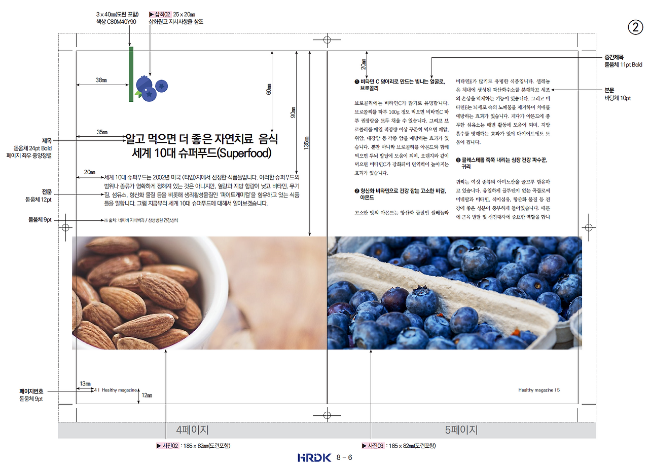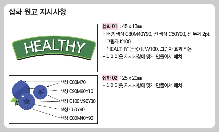 손이 느리긴 하지만 충분한 시간만 있다면 완전히 똑같이 만들어 낼 수 있다. 하지만 실기시험 시에는 주어진 4시간 안에 모든 작업을 완료해야 하기 때문에 일러스트에만 시간을 소요할 수는 없다. 손이 느린 나는 어떻게 하느냐? 지시사항에 맞게 그리지만 비슷하게만 그려놓는다. 삽화 02의 꼭지가 있는 블루베리를 그냥 동그란 블루베리로 모양만 잡아놓는다. 단!! 비율은 정확하게!! 비스무리하게 모양만 잡고, 전체 페이지 작업을 마무리해 놓는다.