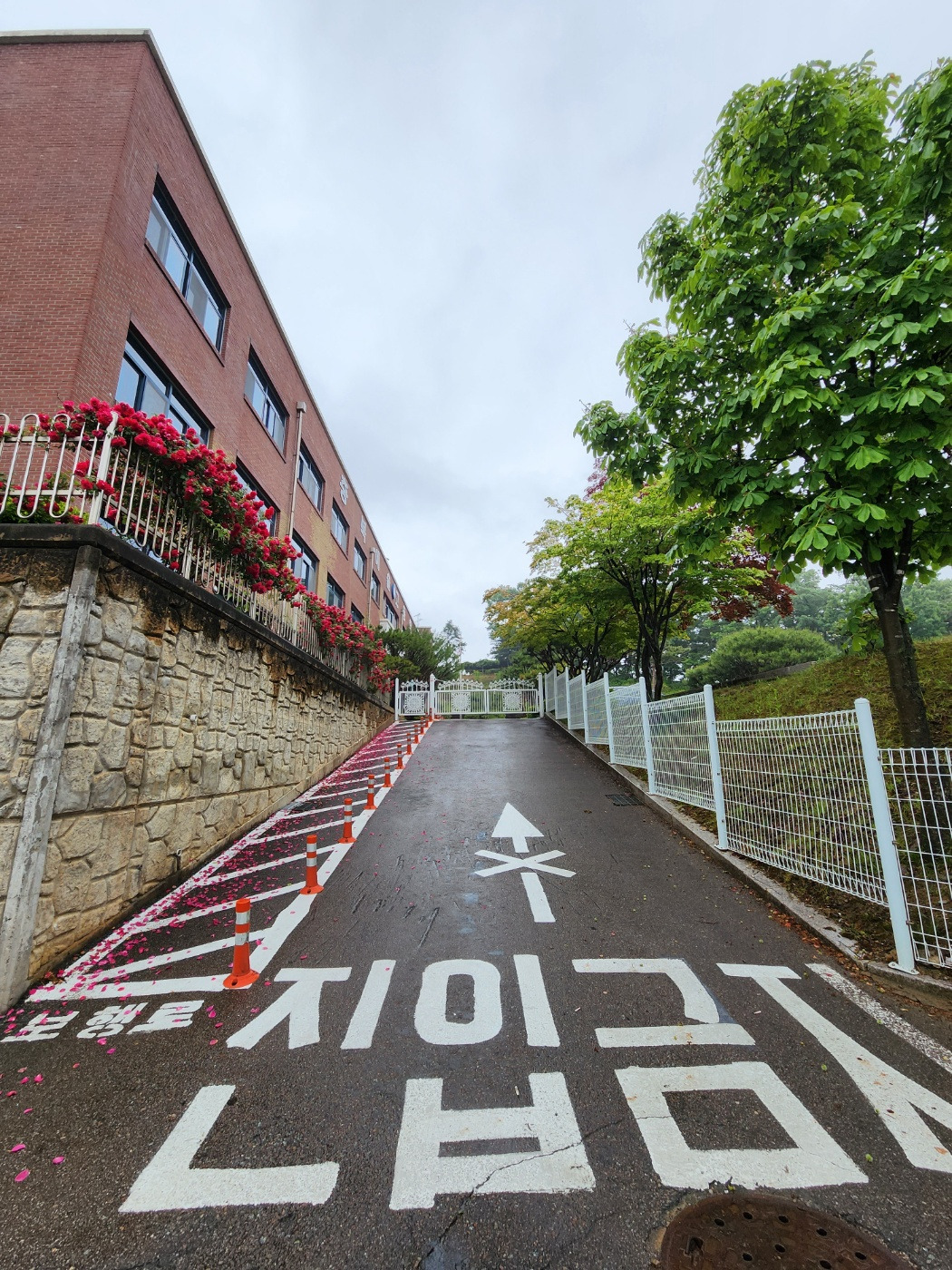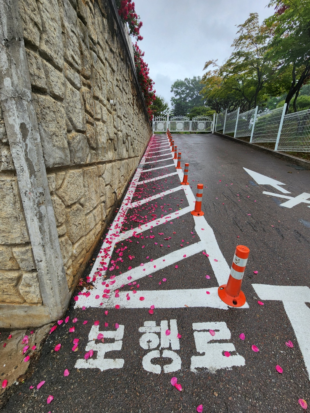 2023.05.28(일) 시각디자인산업기사 필기시험을 치르고, 차를 향해 걷다, 장미꽃 나리는 담벼락을 보게 됐다. 그날은 비가 왔고, 나는 우산이 없었지만 갤럭시 S22 울트라 512G로 기록하기로 했다. '어쩜 저렇게 보행로에만 꽃잎이 떨어졌을까?' 색깔도 너무 곱다. 핑크핑크. 쓰기를 멈추면서, 사진으로라도 기억하자 싶어 가끔씩 이렇게 찍는다. 핑끄핑끄.
