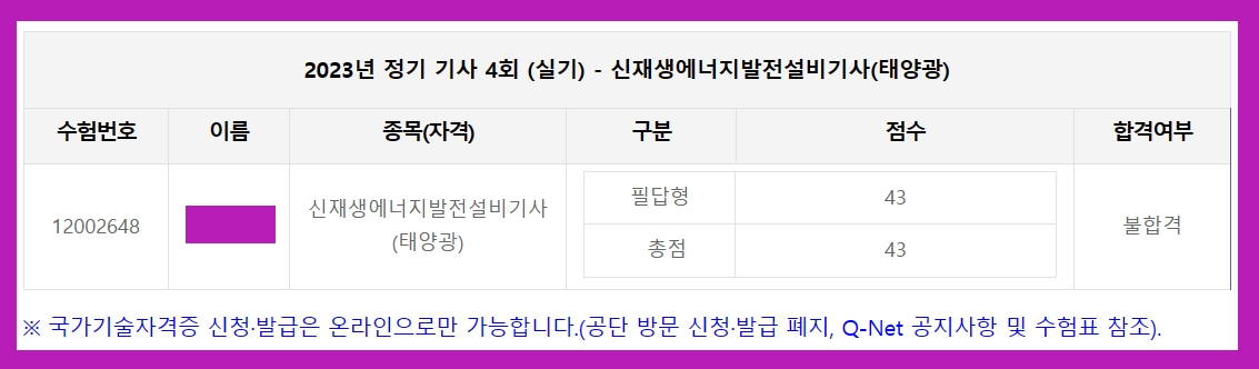 2023년 정기 기사 4회 신재생에너지발전설비기사(태양광) 실기시험을 11월 05일 치렀고, 오늘은 그 발표가 있는 날.