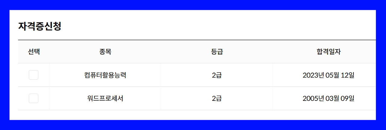 워드프로세서 2급, 사무자동화산업기사, 전산응용토목제도기능사, 정보처리기사, 컴퓨터그래픽스운용기능사, 전자출판기능사, 컴퓨터활용능력 2급. 필기는 합격했지만, 실기를 보지 않아 취득하지 못한 전산응용건축제도기능사, 웹디자인기능사도 "컴퓨터" 관련 자격증이었다.