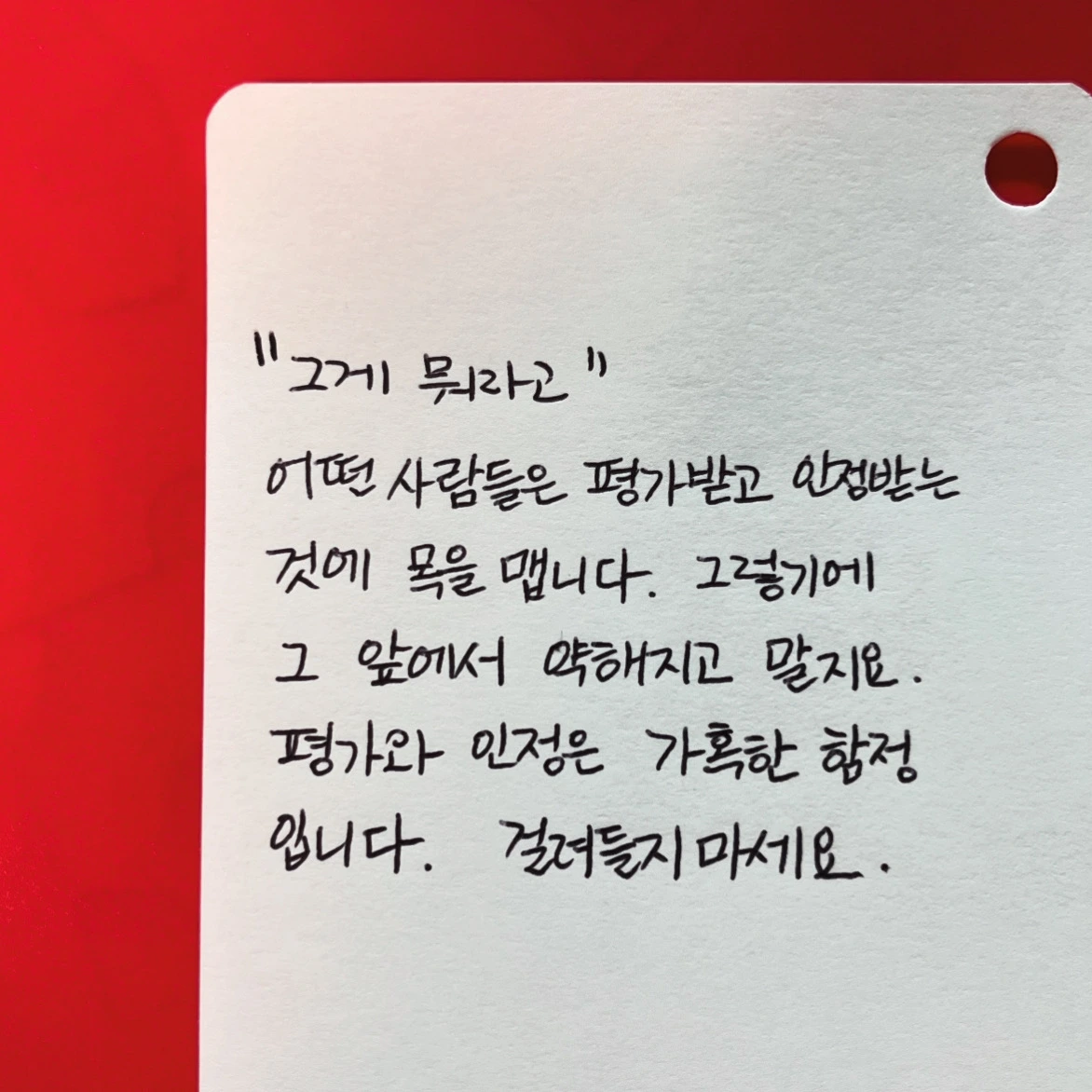 "어떤 사람들은 평가받고 인정받는 것에 목을 맵니다. 그렇기에 그 앞에서 약해지고 말지요. 평가와 인정은 기혹한 함정입니다. 걸려들지마세요." (글귀 출처: 파울로코엘료)