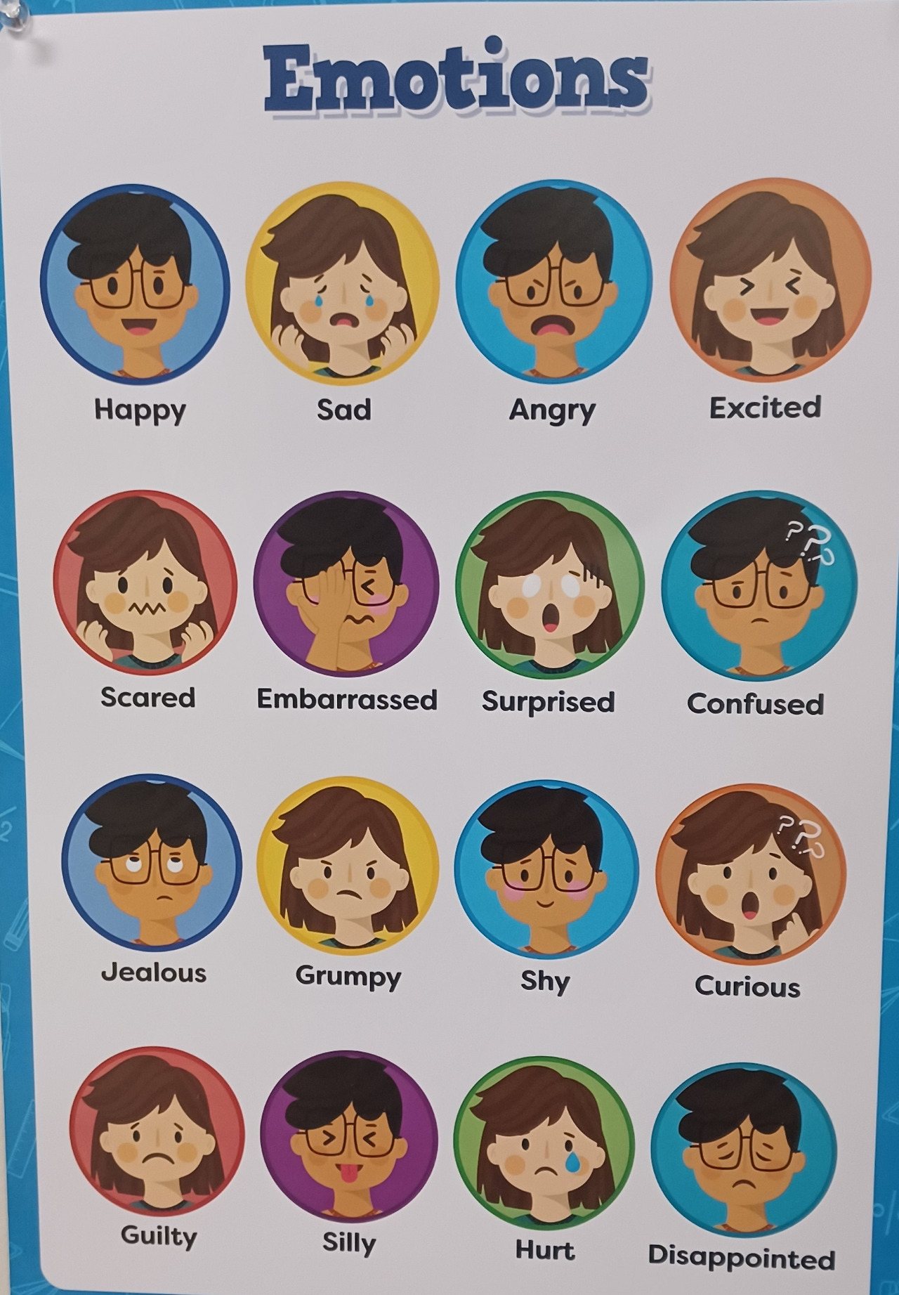 여기서 이들은 먼저 자신의 감정을 들여다봐야 한다. 슬픈 감정인지, 창피한 건지, 화가 난 건지, 놀란 감정인지, 무서운 건지 등등이다. 몇 분 후 선생님은 아이에게 이곳에 보내지기 직전의 상황을 시각적으로 설명한다." I saw your face like this, angry를 가리키고 at the carpet, were your angry?아이가 감정에 이름표를 붙이면 "Why were you angry?"등을 물어보며 상황을 아이들 입으로 설명하게 한다. 그리고 아이들이 그 감정에서 빠져나올 방법도 제시하게 한다. 가령 "Do you think you need a hug to make you feel better?"라든지 "Do you need to tell your friend that how your emtion hurts when he pushes you?"라든지 말이다.