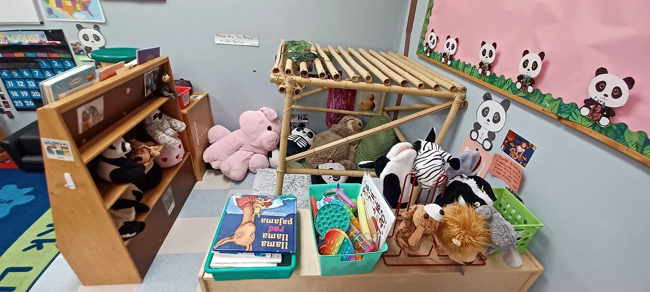 최근 몇 년 동안 이런 아이 숫자가 전반적으로 더 늘어났는지 아니면 우리 학교가 우연히 이런 아이들을 더 많이 받게 되었는지 모르겠지만 ADHD, ADD, 분노 조절이 안 되면서 발달은 발달대로 느린 애들이 너무 많다. 그래서 그런지 몰라도 우리는 Cozy Corner에 엄청 공을 들인다. 이 공간은 액티비티나 놀이에서 벗어나 혼자 차분이 감정을 다스리는 공간이다. 선생님이 주로 아이를 이곳으로 보내고 어떤 아이들은 자발적으로 간다고 말하고 간다. 여기엔 마음을 편하게 해 줄 크고 작은 부드러운 감촉의 인형들이 준비되어있고 손으로 박박 찢어 버릴 수 있는 각티슈와, 음악을 조용히 혼자 들을 수 있도록 CD player, headset, 책, push pops, 향기 좋은 핸드로션 등이 준비되어있어 손등과 손바닥에 문질러 마사지하며 감정을 다스리는 거다.숫자 판도 있다. 숫자를 10 또는 20까지 천천히 셀수 있도록 되어있다.