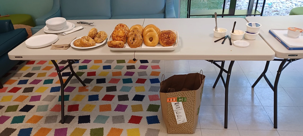 오늘부터는 대부분의 선생님들이 Home visit schedule을 소화해야 한다. 만 1살부터 우리 학교에 다녔고 이런저런 이유로 선생님을 잘 알고 있는 경우를 제외하면 Lead teacher는 부모님과 상의해서 가정 방문을 해야 한다. 두 명의 선생님이 함께 가기도 하지만 보통은 한 명이 간다. 1주일 전 작은 선물과 함께 Welcome letter를 집으로 보내고 가정 방문을 언제 했으면 좋을지 연락 달라는 당부의 말을 써넣는다. 이메일로 대신할 수도 있을 법 한데 이건 마치 전통 같아서 우표를 붙인 편지 봉투에 넣어 직접 보낸다. 쌍둥이 형제를 비롯해 네 가정 정도는 반드시 방문해야 하는데 연락온곳이 없다. 오늘은 좀 느긋하게 크림치즈 베이글과 커피를 곁들인 아침을 먹고 일을 시작했다. 보통은 개학 1주일 전 Teacher's Workday 기간 동안엔 아침 또는 점심이 제공된다. 오늘은 많은 선생님들이 Home visit으로 빠질걸 미리 안 건지 과일도 없는 진짜 간단한 베이글 아침이다. 하지만 공짜인데 감사한 마음으로 먹었다.