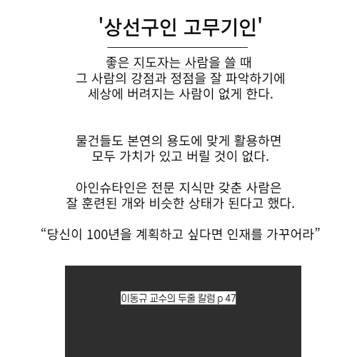 좋은 지도자는 사람을 쓸 때 그 사람의 강점과 정점을 잘 파악하기에