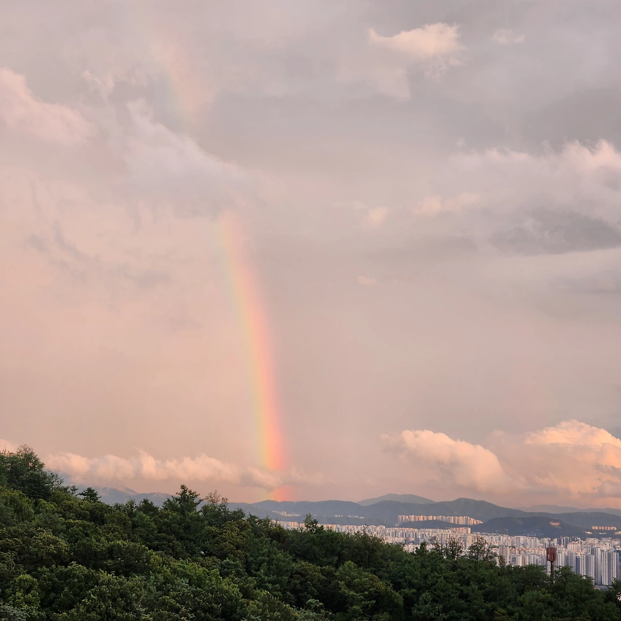 갑자기 굵은 빗방울이 후두둑 떨어진다. 우산을 재빠르게 펼치고 후덥지근한 땀을 뻘뻘 흘리며 팔각정에 도착했다. 정상에 도착해서 숨을 고르고 하늘을 쳐다보니 비가 걷히고 구름 사이에 무지개가 피어있었다. 나도 모르게 ‘너무 예쁘네’ 감탄이 새어 나왔다. 얼마 만에 보는 무지개인가. 먹빛 하늘만 보다가 선명한 일곱 색 무지개를 보니 노아의 방주가 생각났다.