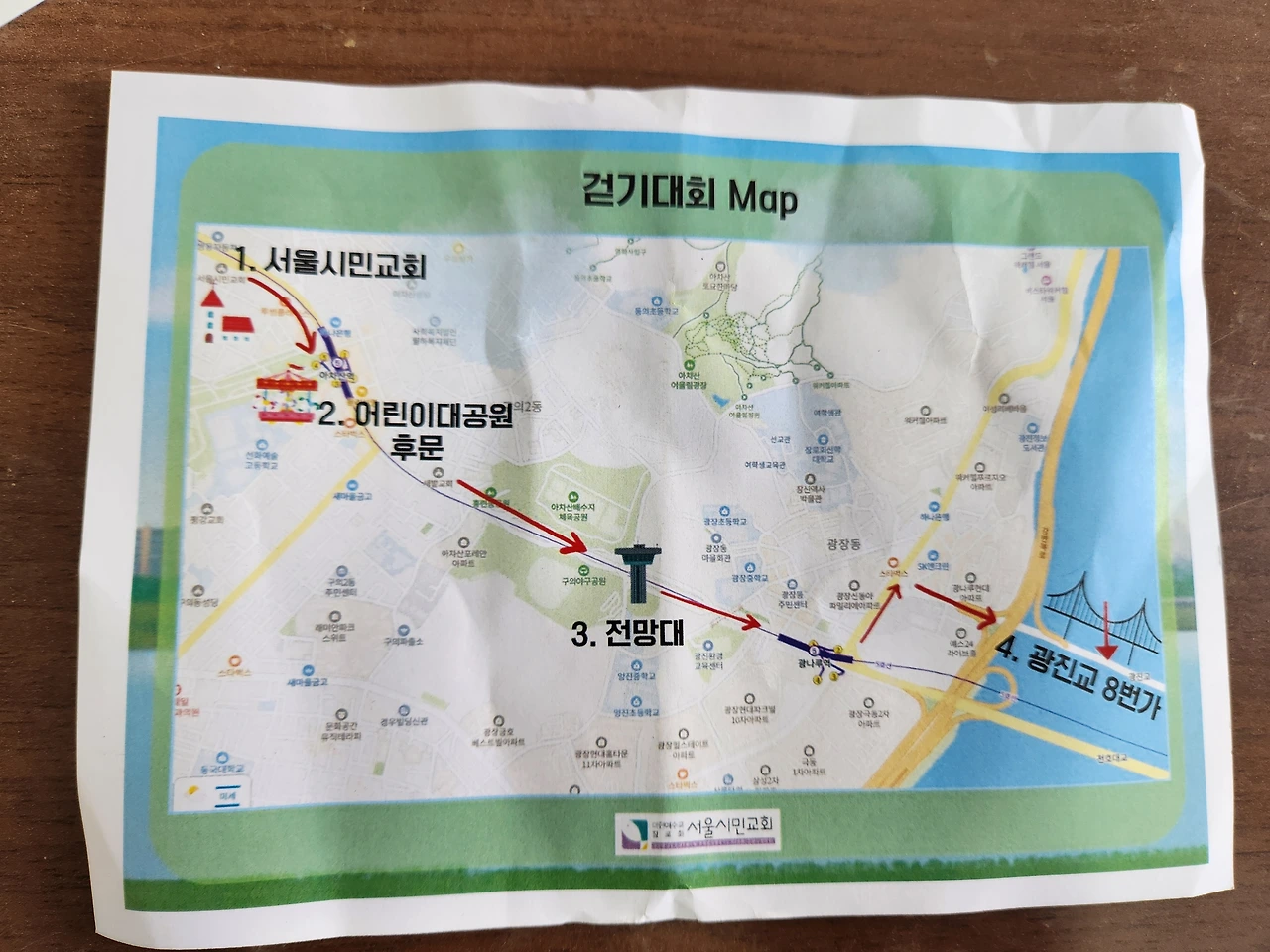 교회에서 출발해 어린이대공원 후문을 지나 광나루역까지,