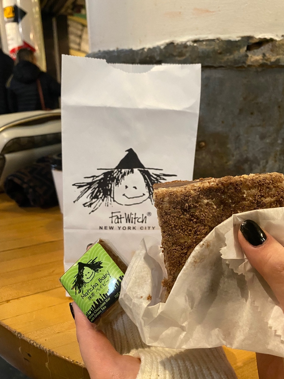 들어가는 입구에서부터 팻 위치 베이커리의 트레이드 마크인 마녀 캐릭터를 볼 수 있는데, 대충 찍찍 그어서 그린 것 같은 캐릭터가 마음에 들었다. 여러 가지 브라우니 중에 우리는 Matcha baby Witch와 German Chocolate Witch 시켰다.