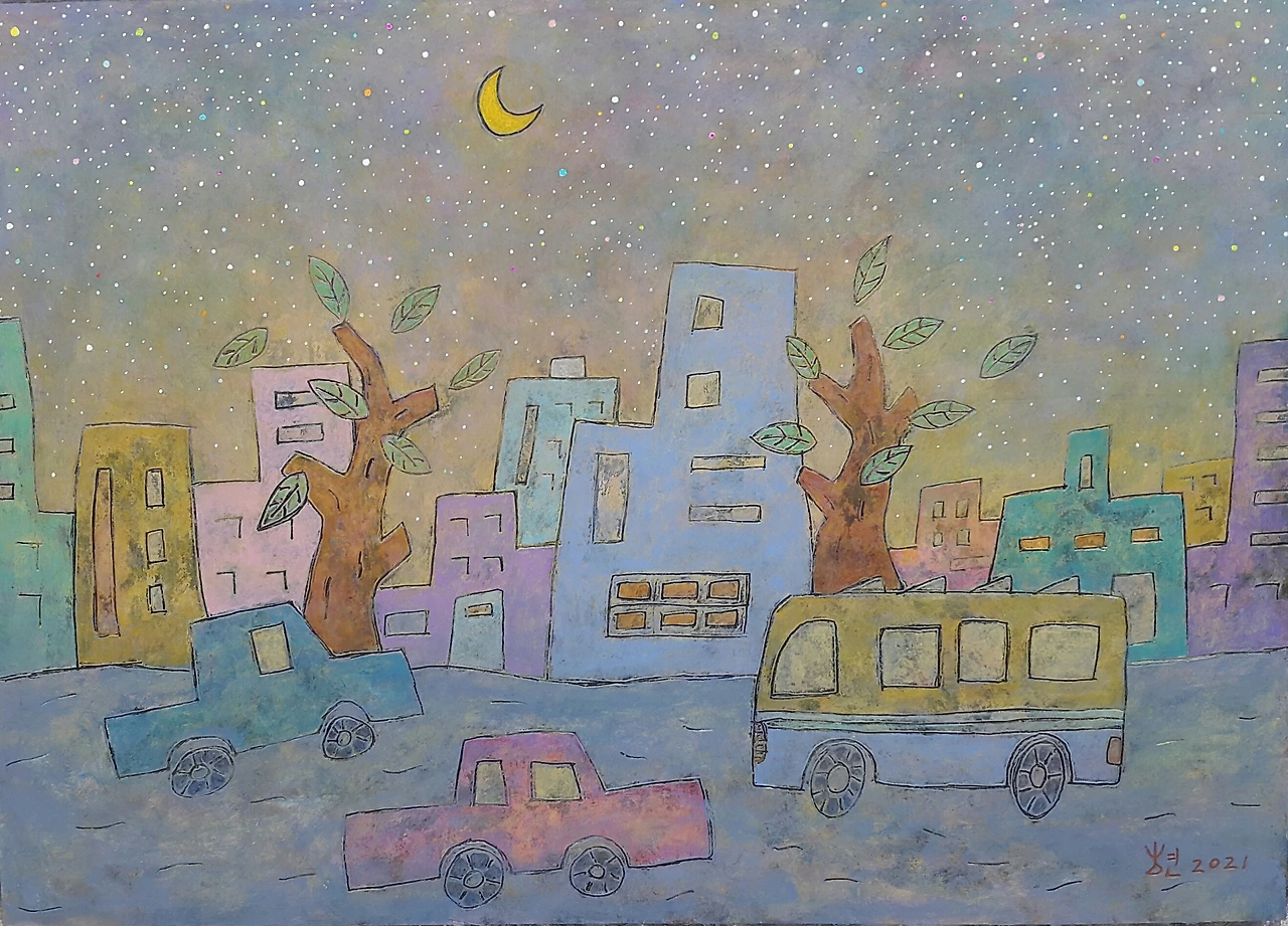 헤아려보면 이제 서울서 산 세월이 더 많다. 의도적으로 도시풍경을 그려보고 싶었다. 도시는 불빛이 너무 많아 밤하늘의 별빛을 모두 삼켜버렸다. 현실에서 볼 수 없는 것도 그림에서 실현할 수 있다. 자동차, 빌딩 숲에도 아랑곳없이 별빛이 총총한 도시의 풍경이다. 이런 풍경이 어디 있느냐고 따지지 마시라. 그냥 내 마음 가는 대로 그릴 뿐이다.