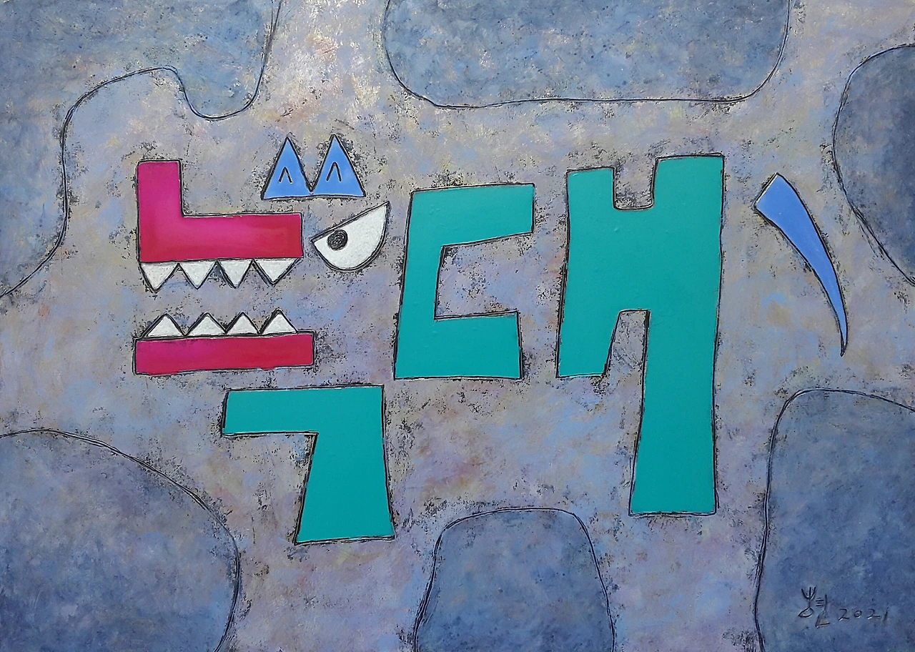 ● <글자 그림ㅡ늑대> - 호일아트(은지화), 30cm×42cm ~ 쿠킹 호일에 한지를 배접한 다음 다양한 독자적 기법을 써서 그린 작품.
