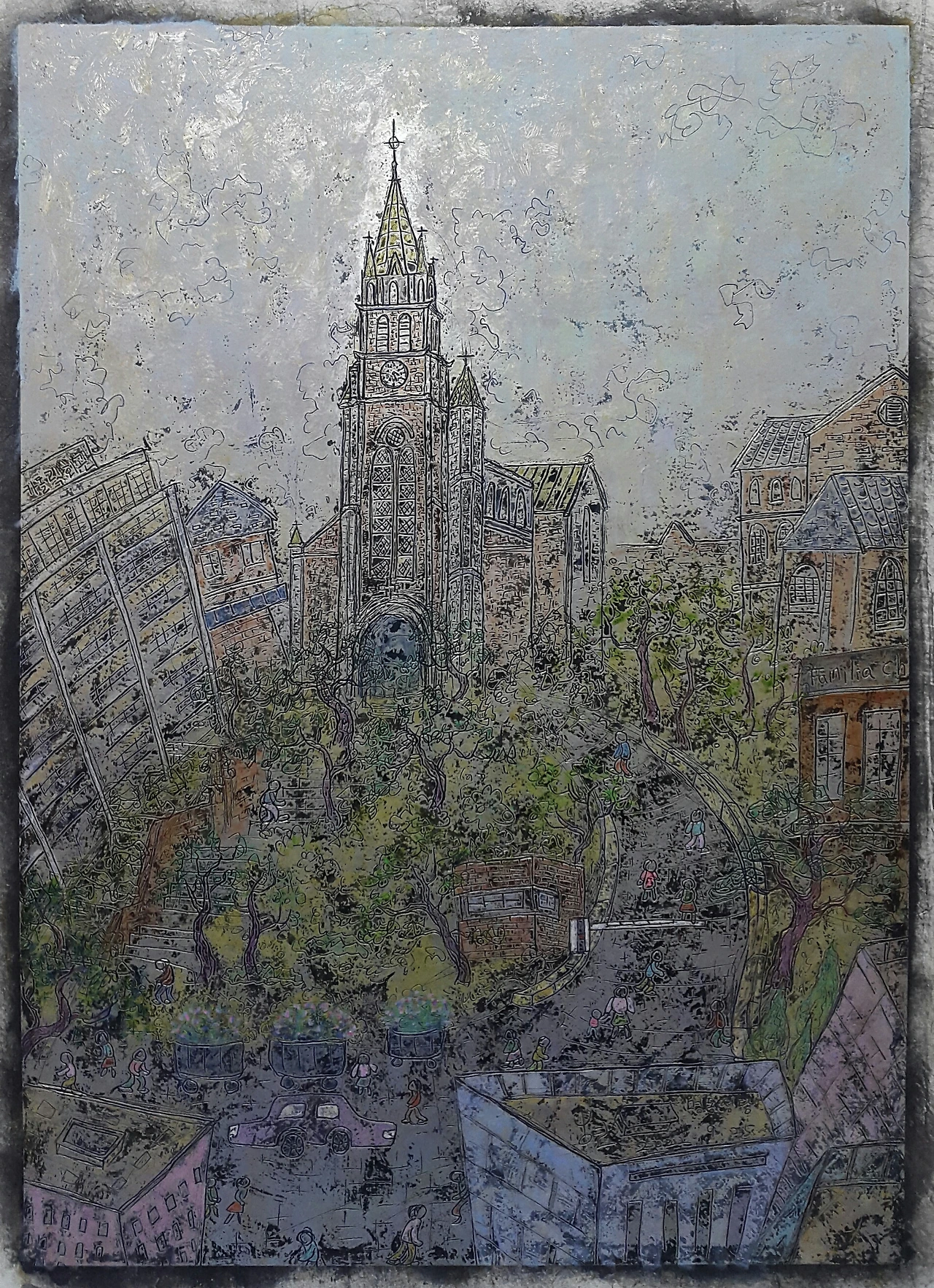 ● <어반 스케치ㅡ명동성당> - 호일아트(은지화), 30cm×42cm ~ 쿠킹 호일에 한지를 배접한 다음 다양한 독자적 기법을 써서 그린 작품.