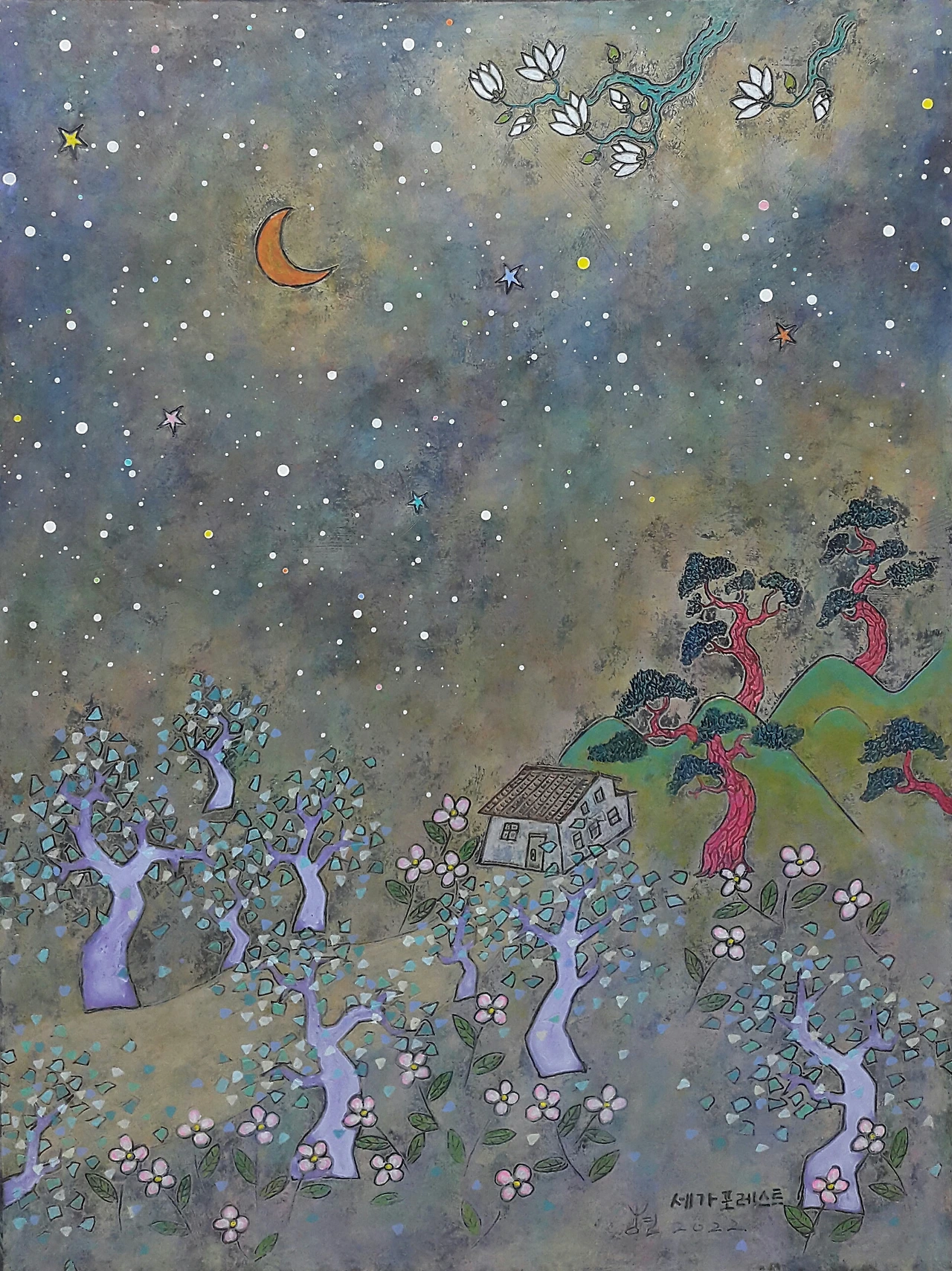 완성된 그림을 앞에 두고 가민히 들여다본다. 집으로 통하는 숲길, 길섶의 야생화, 동산 언덕의 소나무, 그 속에 참선하듯 아늑하게 자리잡은 집 풍경ᆢ 전체적인 분위기가 산뜻하면서도 깊이감이 느껴진다. 새로운 그림 스타일을 터득한 것 같아 이석이조의 느낌이다.