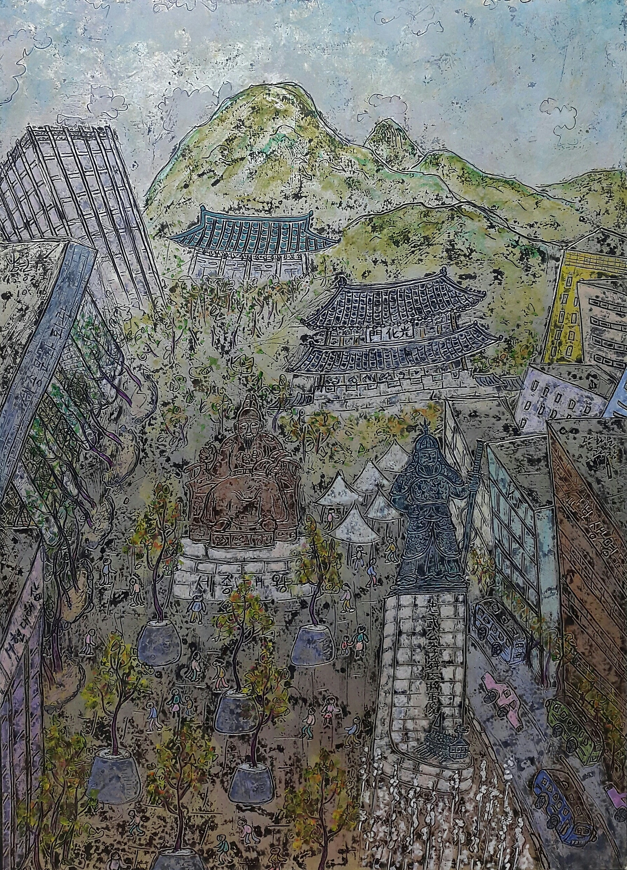 광화문 광장. 불과 6년 전 촛불로 뜨거웠던 곳인데 지금은 퇴색해 공원으로 변모했다. 이왕 공원을 만들 바엔 나무를 더 심었으면 좋겠다 싶기도 하다. 광장의 대표적 상징물인 이순신 장군과 세종대왕 동상을 중심으로 멀리 광화문 현판, 청와대, 북악산, 그리고 정부종합청사를 비롯한 주위 건물들을 한 화면에 담아보았다. 눈썰미가 좋은 사람이라면 실제와 반대로 그린 것도 발견할 수 있을 것이다. 일부러 그렇게 그린 것이니 실수가 아니다. 심심하면 찾아봐도 좋을 것이다.
