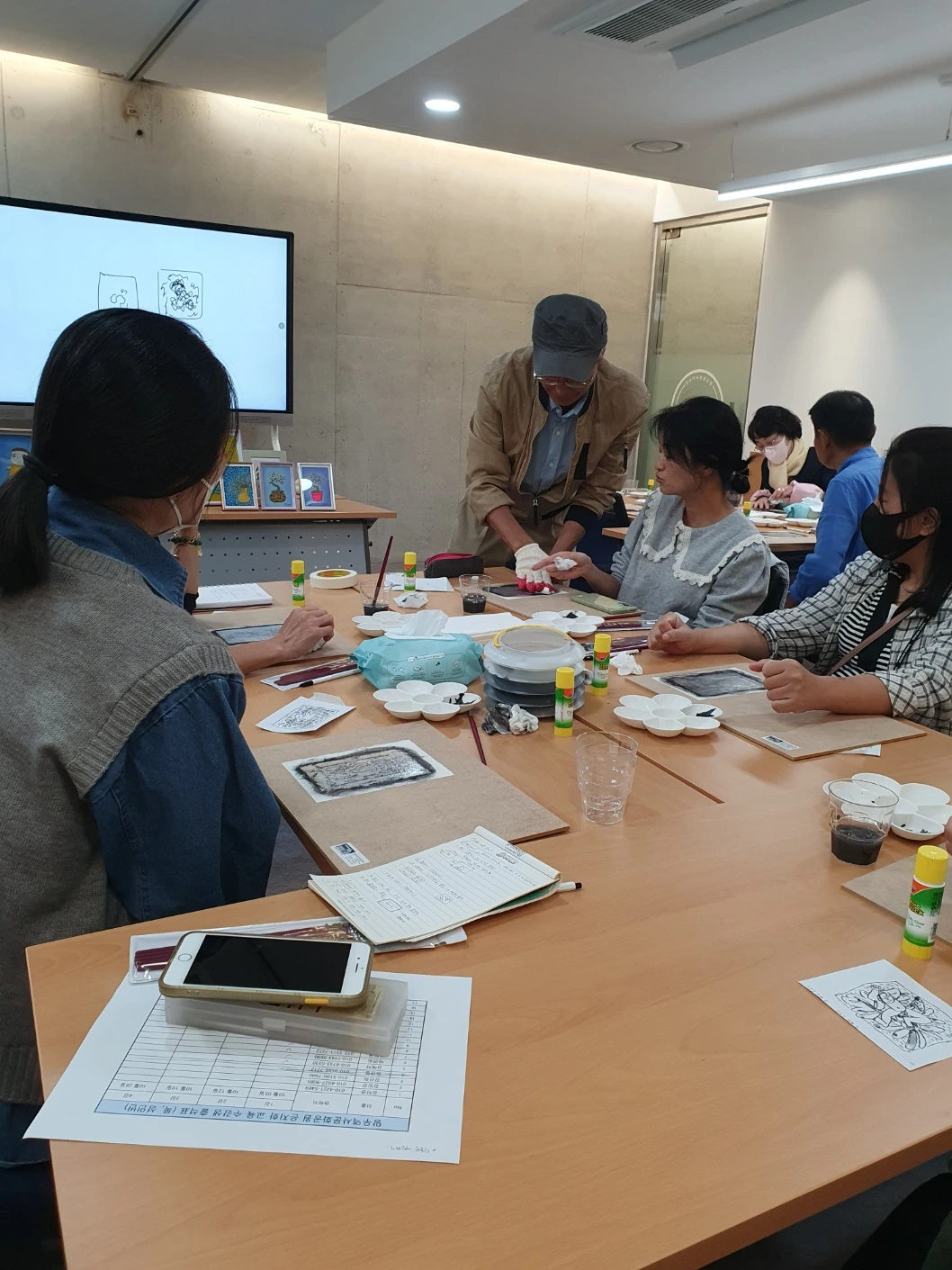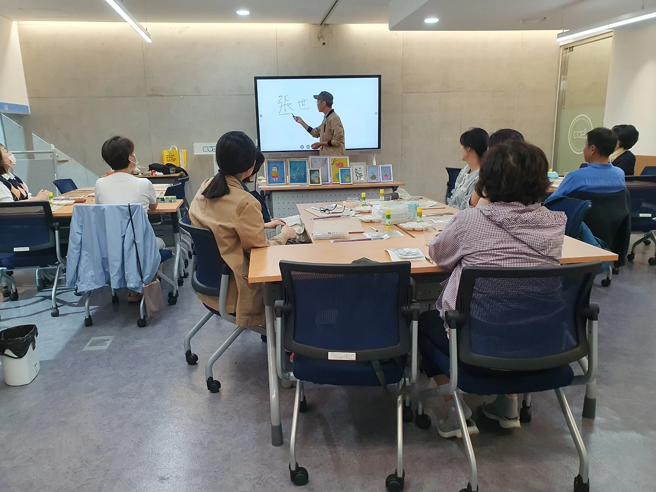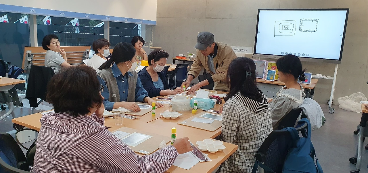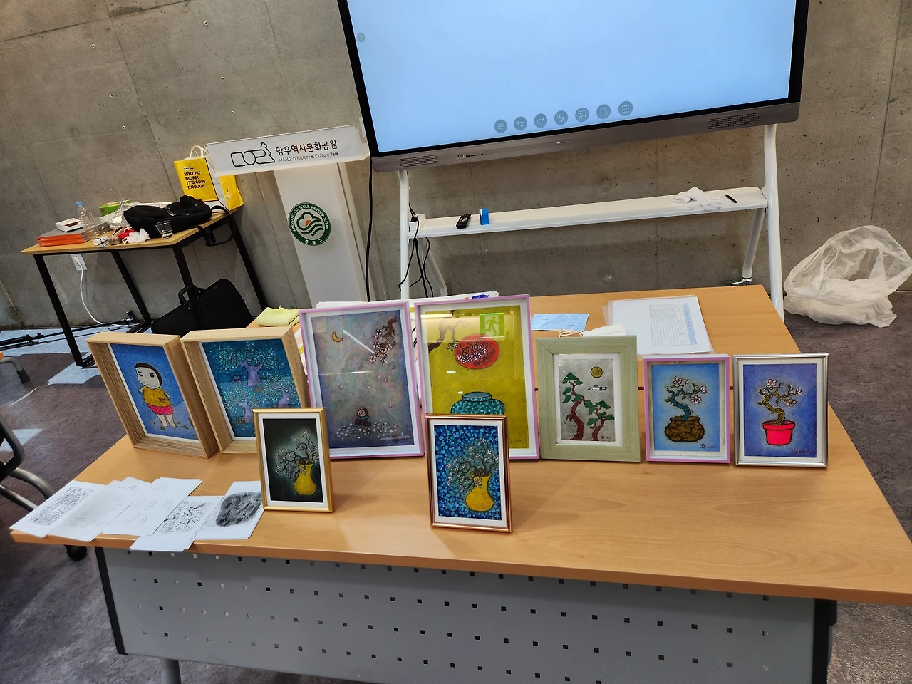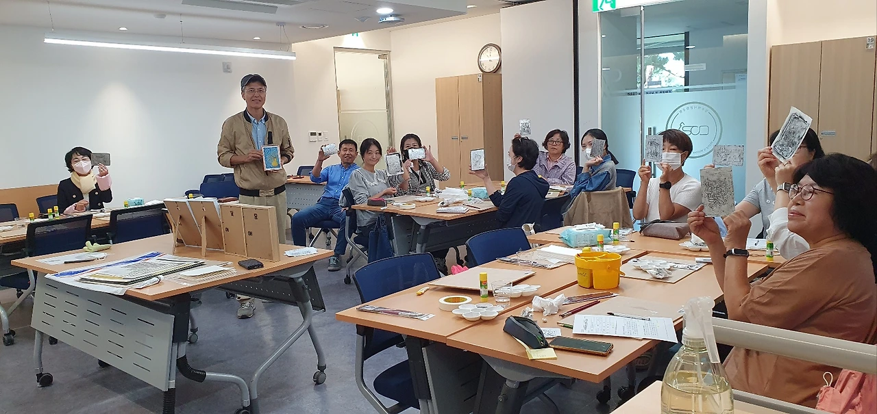이곳에 묻힌 예술인은 비단 이중섭만이 아니다. 이름만 대면 알 만한 유명인들이 적지 않다. 그 때문일까? 올 가을 공원 전시관에는 <시대의 예술, 망우에서 만나다>라는 주제로 추모전이 열리고 있다. 그 일환으로 은지화 그리기 강습도 진행된다. 매주 목, 토요일 앞으로 10월 한달간 이어지는데 오늘은 그 첫 시간이다. 행사 담당자의 요청에 따라 이중섭의 작품을 그가 담배 은박지 그림에 썼던 기법 그대로 완성했다. 모두들 신기한 경험에 놀라워한다.