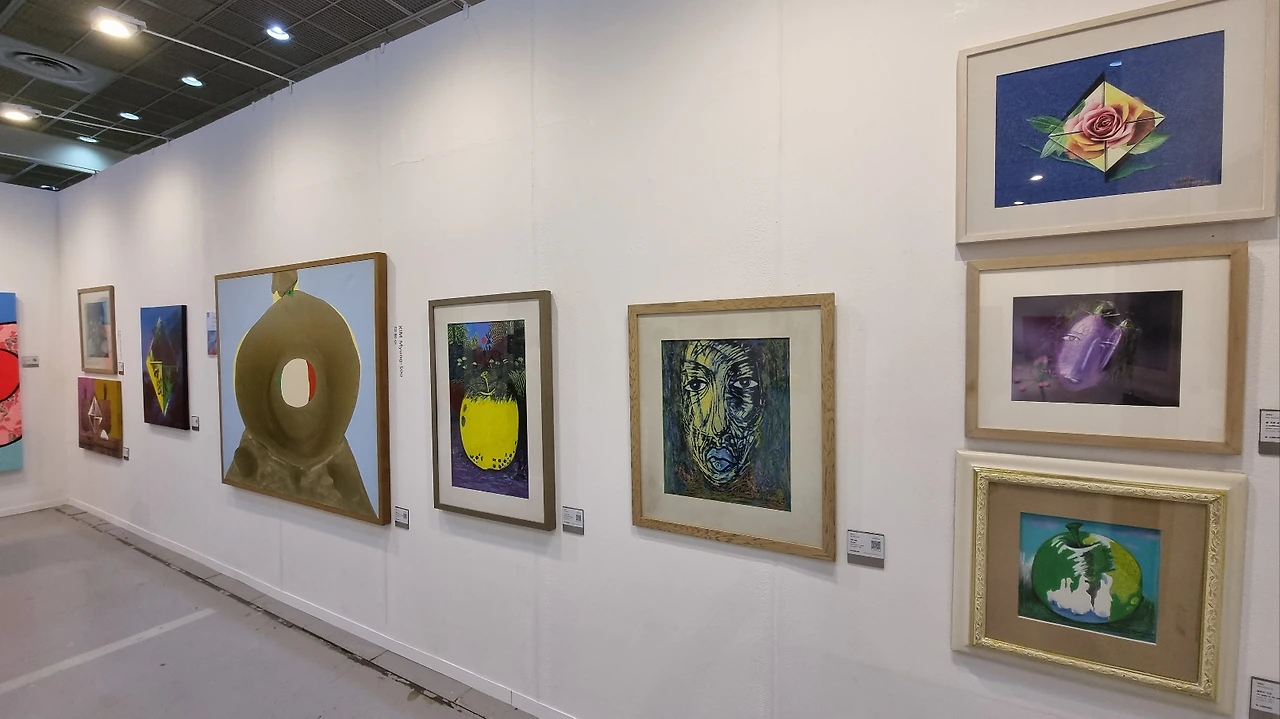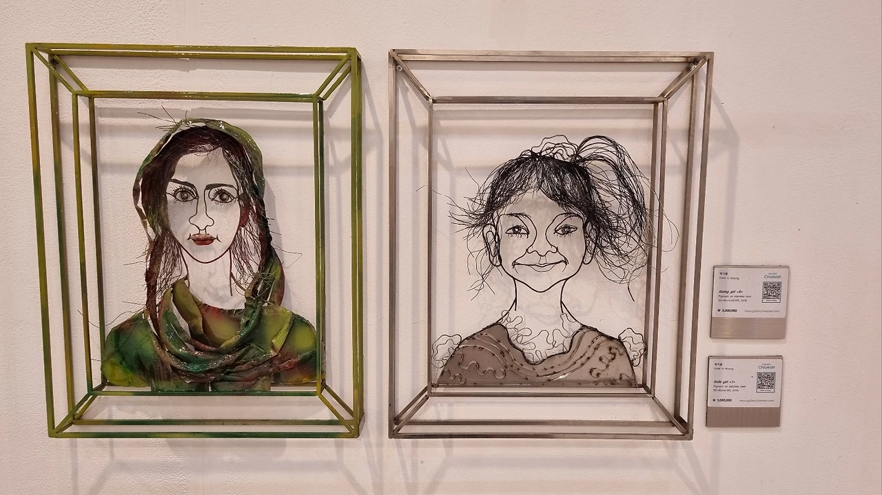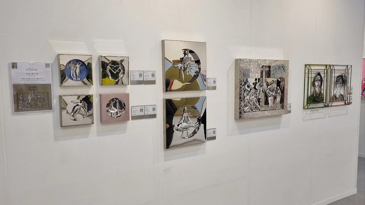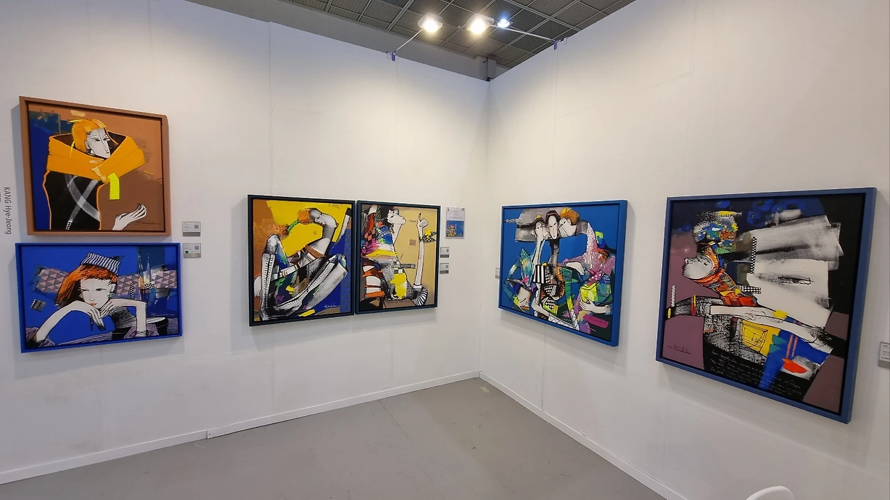 경쾌하면서도 화려한 색채감으로 관객의 눈길을 사로잡는 강혜정 작가님, 도회적 패셔니스타의 은밀한 욕망과 고독을 발랄하게 그려내는 전현경 작가님, 인간 퍼즐로 내면의 다중 자아를 표현하는 최영미 작가님, 다양한 인생의 장면을 심오하게 담아내는 스틸 아티스트 박기웅 작가님, 우주의 원형 둥근 원으로 아름다운 심미적 이미지를 창조하는 경달표 작가님, 프린팅 화면을 활용해 기발한 이미지 전환을 이뤄내는 고 김명수 화백님, 그리고 은지화라는 엉뚱하고 해괴한 듣보잡(듣도 보도 못한 잡놈) 작가로 발을 담근 저도 한몫을 했죠.