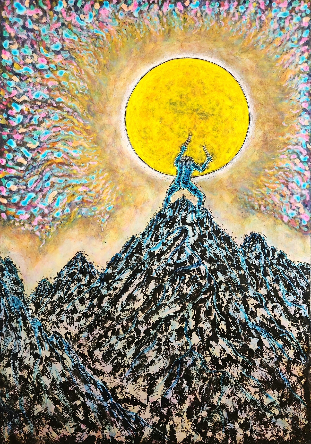 ● 달을 두드리는 사람 Person beating the moon, 72cm×50cm, 은지화 Acrylic on foil under Korean paper, 2023, (20M) 호일아트(은지화)~ 쿠킹 호일에 한지를 배접한 다음 다양한 독자적 기법을 써서 그린 작품.