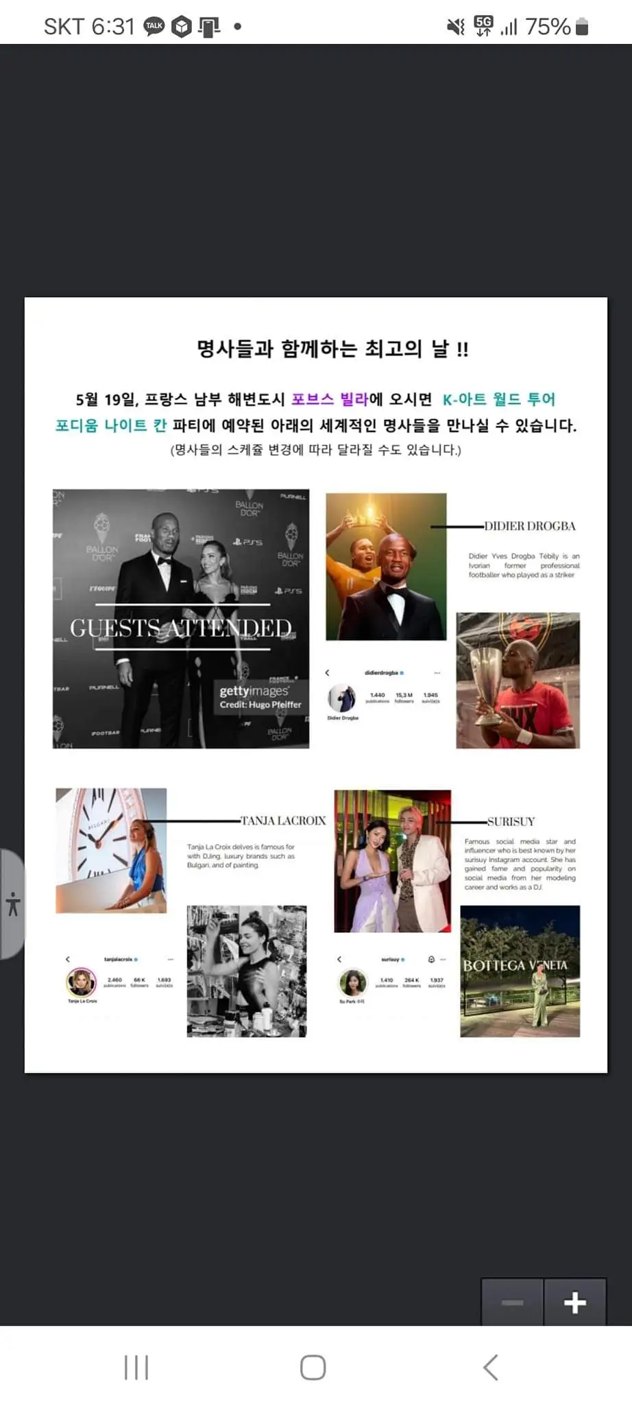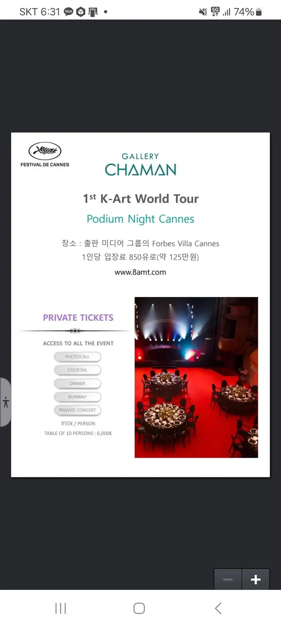 패션쇼와 함께 참가한 작가들의 작품을 선보이는 아트 런웨이도 마련된다. 칵테일과 디너쇼를 겸한 이 행사는 오후 7시부터 자정까지 진행된다. 칸 영화제를 기념하기 위해 파티명을 ‘칸 포디움 나잇’으로 정했다.