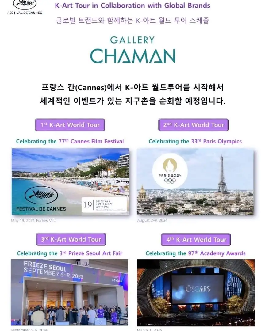 칸 영화제 기념 K-아트 월드투어에 이어 올해 파리 올림픽 기간에는 제33회 올림픽 기념 제2회 K-아트 월드투어를 추진한다. 이 전시는 파리의 유명 호텔에서 8월 2일부터 9일까지 8일간 초대전 형태로 진행된다.