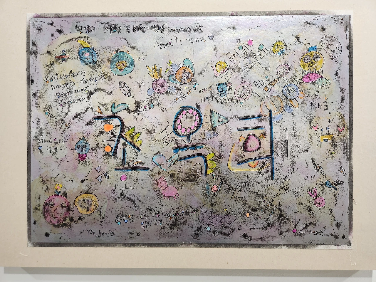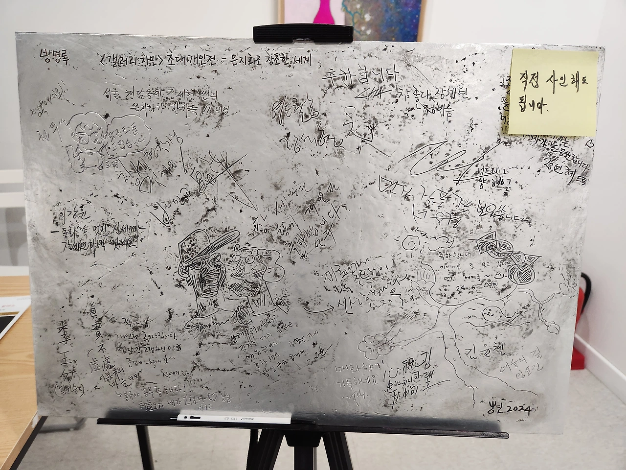 그렇게 생명을 얻은 작품이 내게도 있다. 전시 방명록, 혹은 오가는 사람들의 흔적을 은지화 화면에 새겨 작품화시키는 것이다. 미술품 전시는 화가가 생산의 주체가 되고, 관람객이 소비의 객체가 되지만 이 작품은 화가가 소비의 객체가 되기도 하고, 관람객이 생산의 주체가 되기도 한다. 은지화 제작을 체험하는 일종의 아트 퍼포먼스인 셈이다. 나는 이것을 쌍방향 그래피티 아트라 이름붙일 생각이다. 전시장을 방문하시게 된다면 이름이든 싸인이든 그림이든 꼭 흔적을 남기시길 바란다.