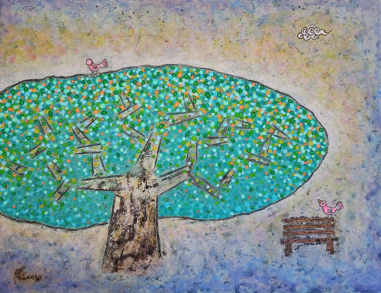 (* 그리면서 제목을 고민했다. 휴식으로 지을까, 설레임으로 지을까. 나무와 의자에 초점을 맞춘다면 휴식이 좋고, 새 두마리에 초점을 맞추면 설레임이 맞을 듯하다. 결국 휴식으로 지었다. 의자를 비워두었으니 누구든 그림 속에 들어가 편히 쉬시다 가시라!)
