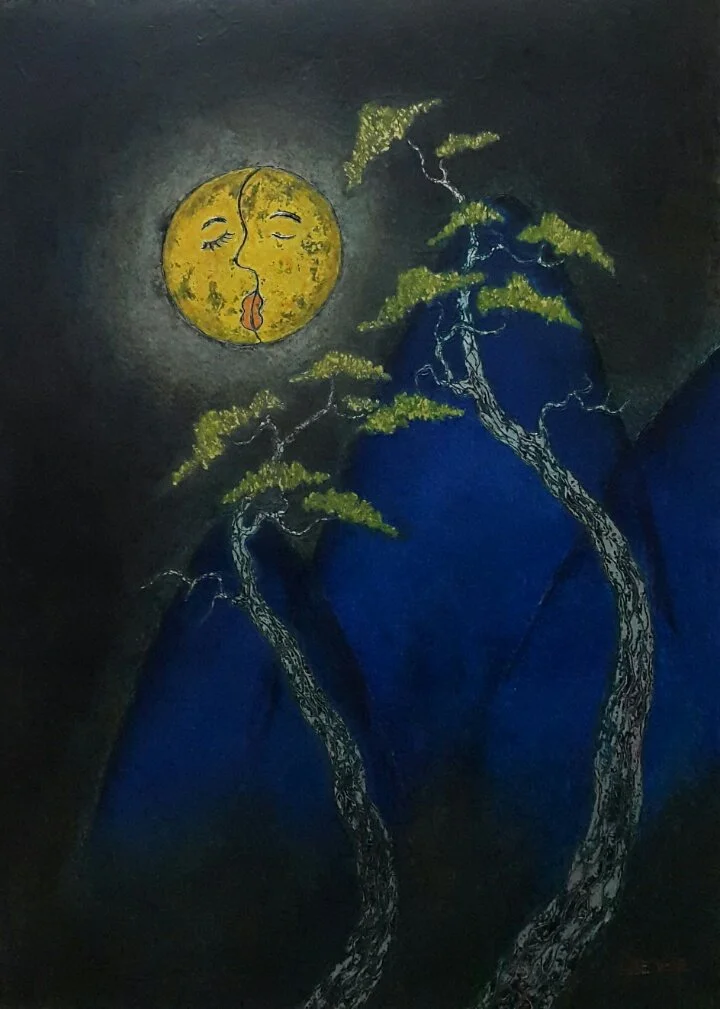 이번 그림에서 조직해낸 것은 동양적인 문인화풍의 배경에 피카소의 큐비즘을 활용한 화면 구성이다. 굳이 말하자면 동도서기인 셈이다. 요즘 주로 쓰는 색이 블루인데, 푸른 색조가 좀 무겁고 어두운 느낌을 준다는 고정관념을 깨고 싶어 낭만적 로맨스를 소재로 삼았다. 잘 보면 로맨틱을 넘어 다소 야하기까지 하다. 무거운 것도 무겁지 않게, 야한 것도 야하지 않게 표현하는 것이 예술의 묘미가 아닐까 싶다.