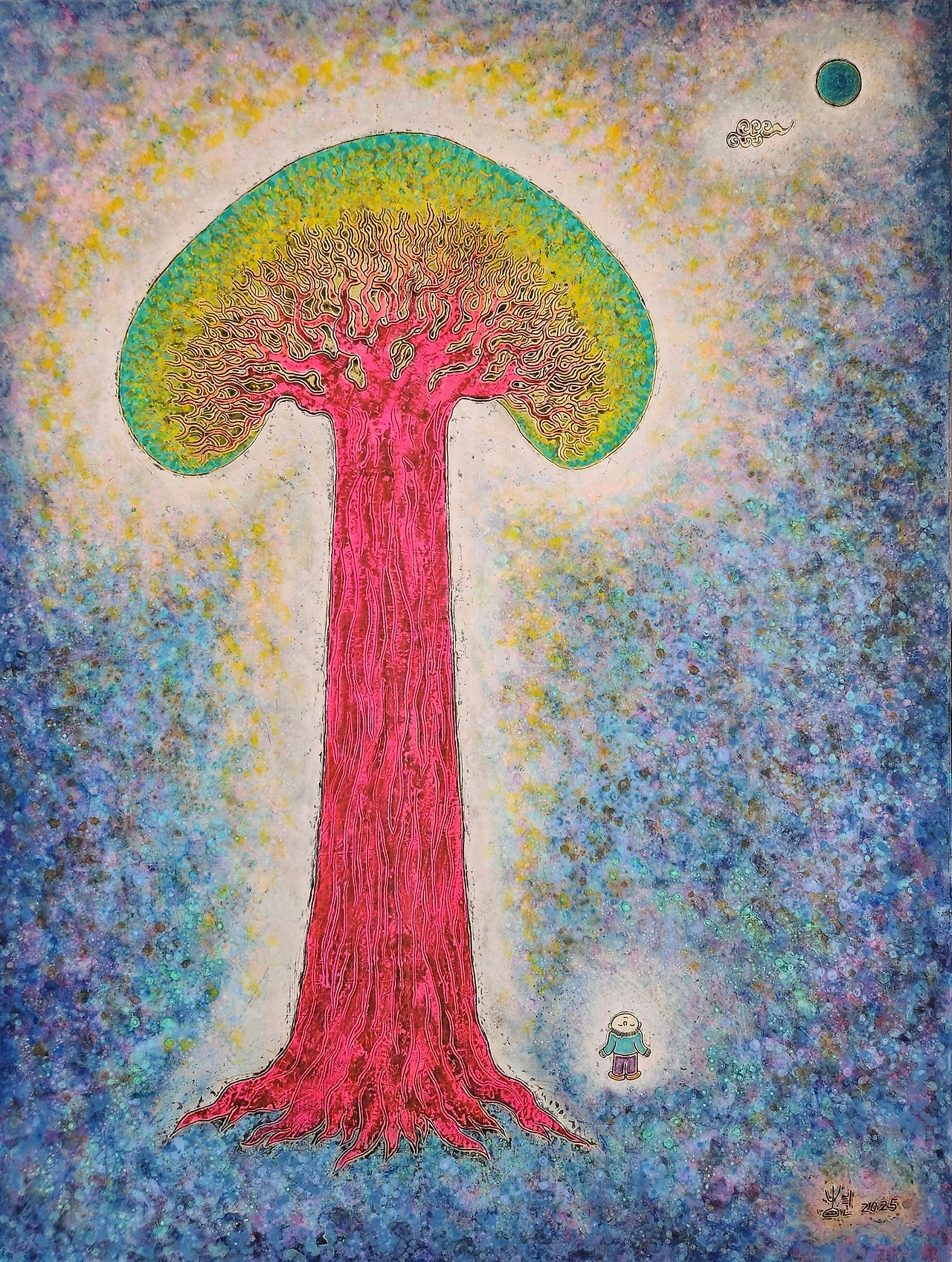 ● <바오밥 용혈수> - 호일아트(은지화), 80.3x60.6cm ~ 쿠킹 호일에 한지를 배접한 다음 다양한 독자적 기법을 써서 그린 작품.
