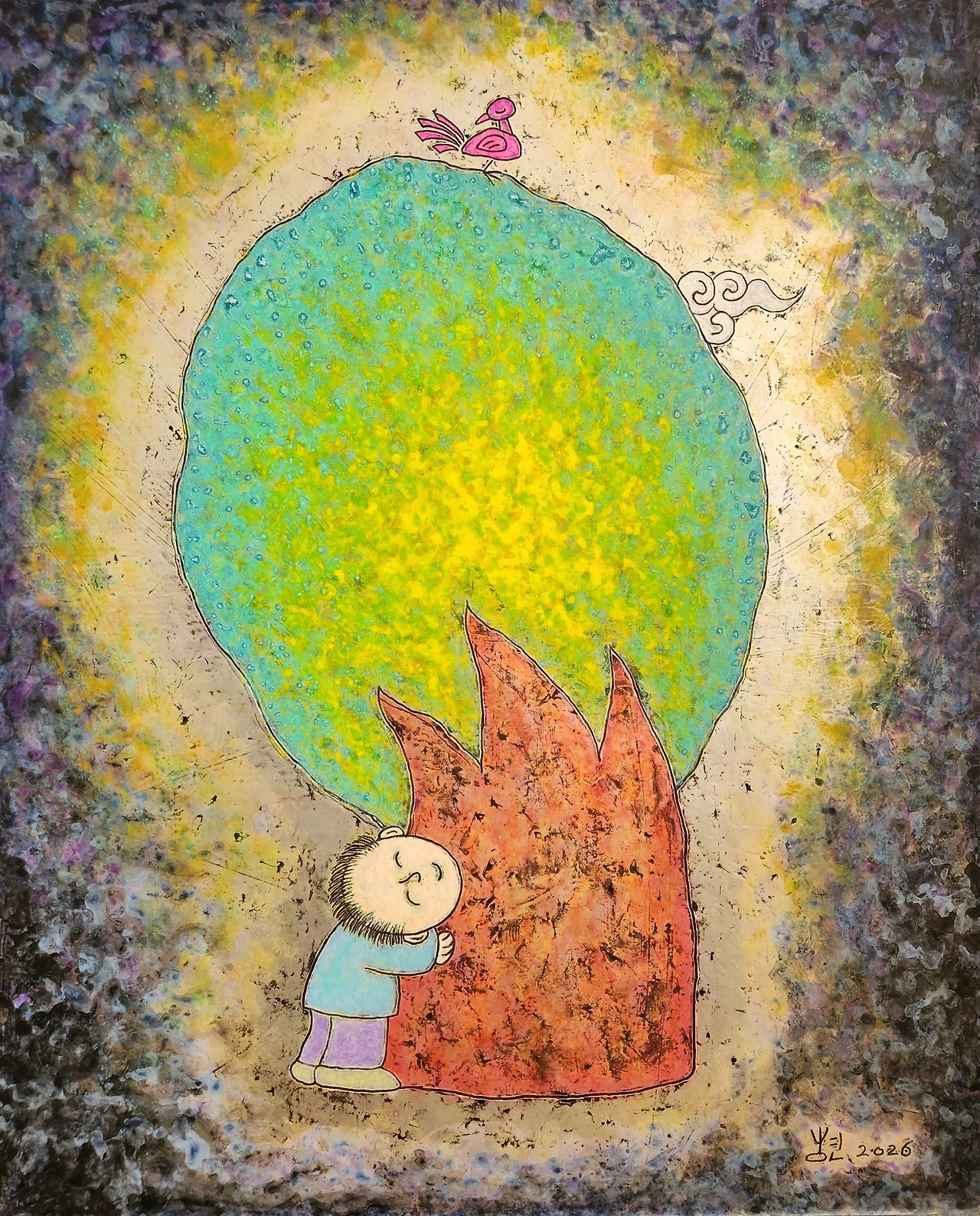 ● <포옹> - 호일아트(은지화), 65.1x53.0cm (15F) ~ 쿠킹 호일에 한지를 배접한 다음 다양한 독자적 기법을 써서 그린 작품.