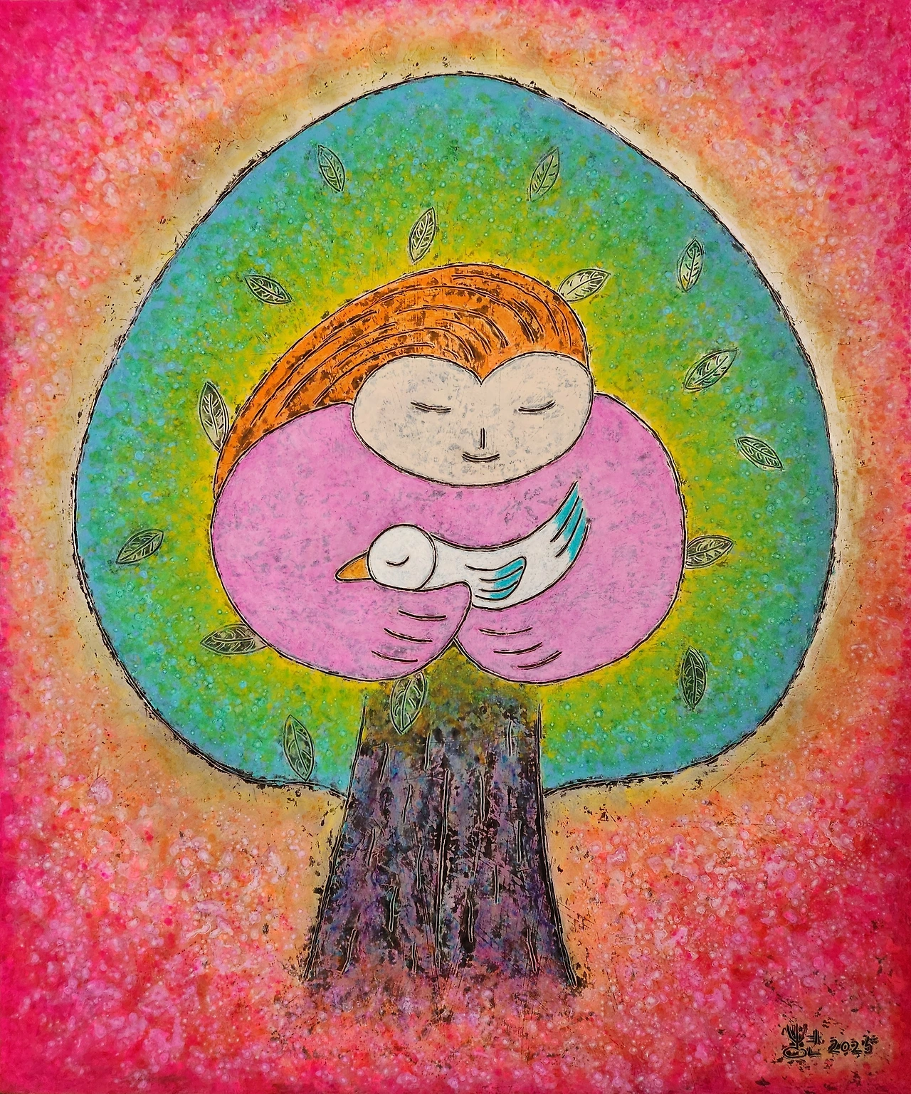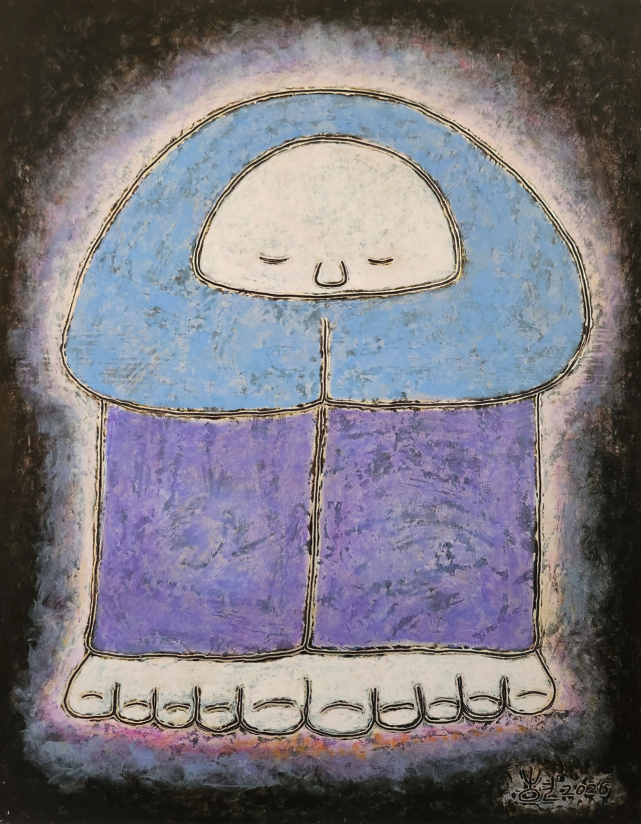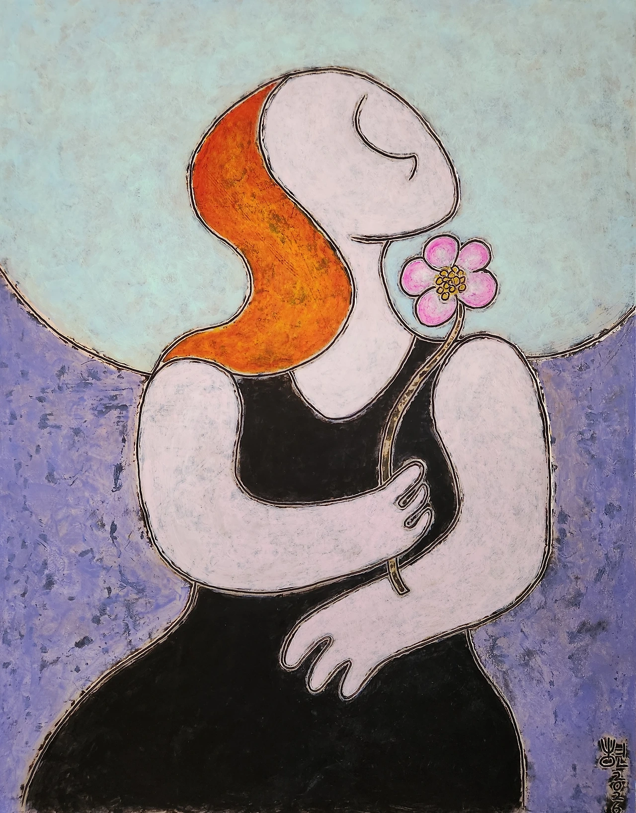 은지화가 뭐냐구요? 간단히 얘기하면 여러분이 흔히 쓰는 주방용 쿠킹 호일 위에 그림을 그리는 겁니다. 이중섭의 담배 은박지 그림에 착안하여 개발한 독창적 미술기법인데요. 한지에 호일을 배접한 다음 밑그림을 새기고, 아크릴 물감으로 여러 가지 기법을 써서 완성한 작품입니다. 실제 작품을 보면 종이나 캔버스 그림과 달리 아주 묘한 색감과 질감이 납니다.