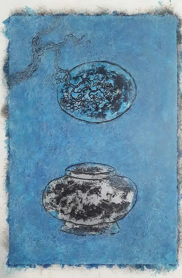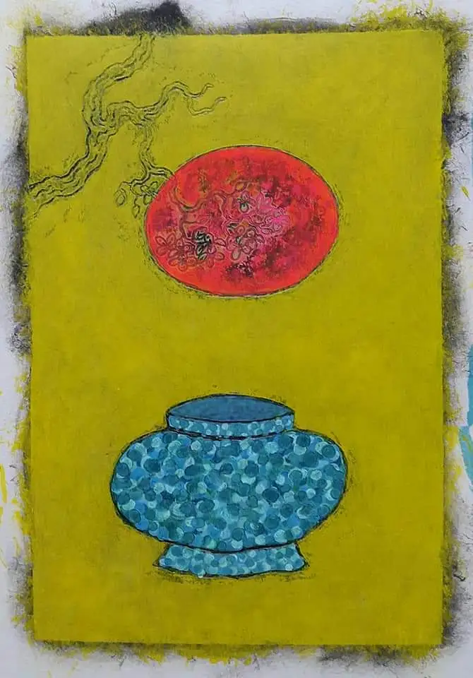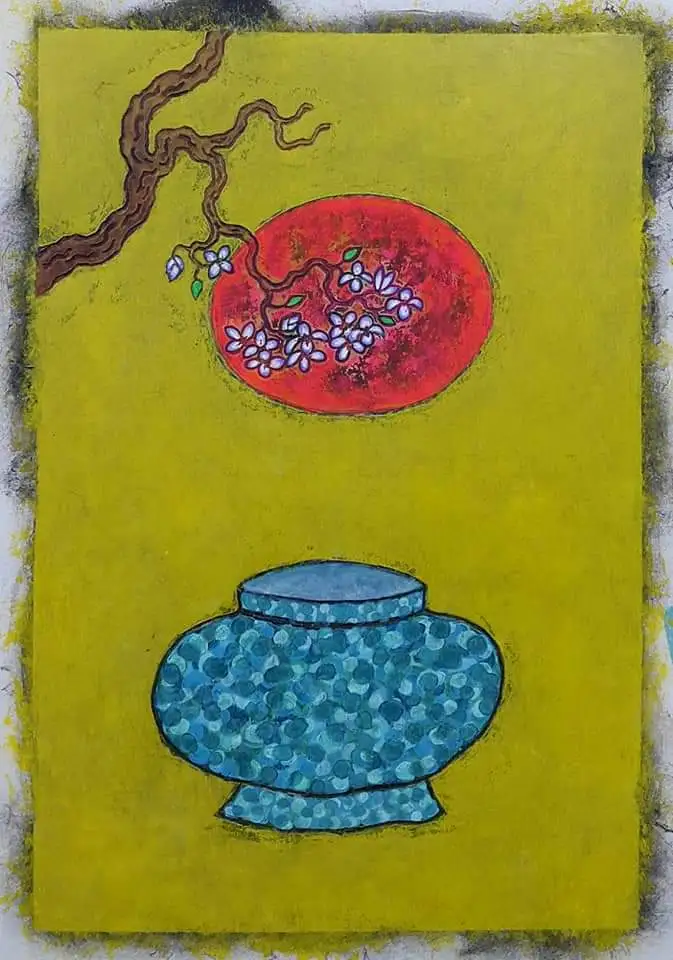 은지화가 뭐냐구요? 간단히 얘기하면 여러분이 흔히 쓰는 주방용 쿠킹 호일 위에 그림을 그리는 겁니다. 이중섭의 담배 은박지 그림에 착안하여 개발한 독창적 미술 기법인데요. 쿠킹 호일 위에 아크릴 물감을 여러 번 올린 뒤 한지로 배접한 작품입니다. 실제 작품을 보면 종이나 캔버스 그림과 달리 아주 묘한 질감과 색감이 납니다.