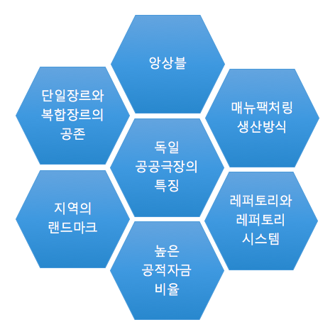 레퍼토리는 독일 극장 시스템과 극장 운영의 기원이자 핵심 개념이다. 연극, 음악극(오페라, 오페레타), 뮤지컬, 콘서트, 발레, 무용, 그리고 최근 몇 년 동안 주목받고 있는 퍼포먼스 장르의 모든 공연 작품의 총합이라 정의할 수 있다. 또한 다양한 장르의 요소를 결합하고 통합하는 데 중점을 두고 있다. 레퍼토리는 고대 그리스와 르네상스 시대의 음악극에서 연극의 기원과 함께 성장하고 발전해 왔다. 따라서 여러 장르는 각 시대의 뛰어난 작가와 작품이 등장하여 이전 시대의 레퍼토리를 보완하고 발전시킨다. 가장 이상적인 경우는 시대를 초월한 작품이 대본으로 남게 되는 것이다. 프로그램을 기획할 때 각 극장의 레퍼토리를 가지고 디자인할 수 있다. 레퍼토리는 전통적인 소재의 각색, 현재의 새로운 무대와의 결합 그리고 완전히 현재를 대변하기도 한다. 따라서 현대 예술가, 젊은 작가 또는 이미 확립된 작가, 작곡가 및 안무가의 작품으로 보완된다. 이러한 방식으로 독일 극장 시스템은 젊은 예술가를 홍보하는 중요한 도구가 되는 동시에 전통 및 현대 작품의 무대, 연주를 통해 콘텐츠, 예술 및 미학 측면에서 계속 발전하고 있다.