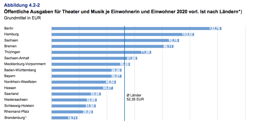 2020년 GDP 대비 극장과 음악 부문 지출은 0.14%, 전체 공공 예산과 비교하면 0.59%에 해당하며, 1인당 54.81유로로, 2019년 대비 8.4% 증가하였다. 연방 정부의 지원을 제외한 1인당 지출은 평균 52.35유로이다. 베를린은 2020년에 주민 1인당 122.78유로로 가장 높은 1인당 지출을 기록했다. 주민 1인당 극장과 음악 부문 공공 지출이 가장 높은 주는 작센으로 92.16유로이며, 브란덴부르크가 18.71유로로 가장 낮았다.