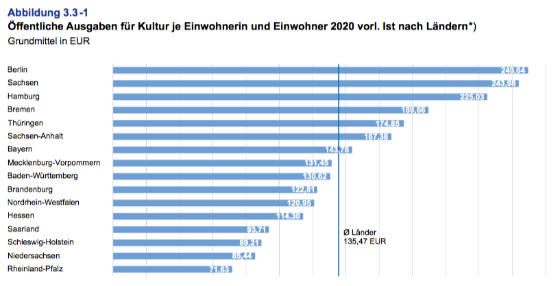 다시 연방별 1인당 공공 문화 지출을 보면 라인란트팔츠주는 71.63유로이며, 베를린과 작센주는 각각 246.64유로와 243.98유로로 약 3배에 달한다. 문화 기관 주변 지역에 거주하는 시민들이 주로 이용하는 도시 주들의 1인당 문화 지출 비율이 높다는 것을 예상할 수 있으며 연방 평균 1인당 135.47유로를 공공 문화 분야에 지출했다.