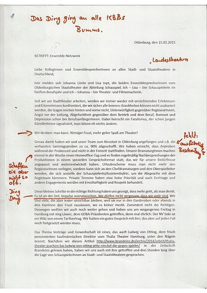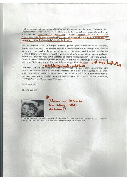 2015년 2월 15일 올덴부르크에서 작성된 이 편지는 실제로 전국의 공공극장에 보내졌으며 두 예술가에 의해 "앙상블 네트워크"가 창단됐다. 앙상블 네트워크는 예술가와 예술 스태프의 중요성과 처우 개선을 위한 캠페인을 성공적으로 진행하고 있는 비영리 단체로 2016년부터 등록된 협회로 활동하고 있다. 이 협회는 처음에는 공적 자금을 지원받는 극장의 근무 조건과 예술적, 사회적 이슈에 대한 앙상블의 발언권에 초점을 맞췄다.