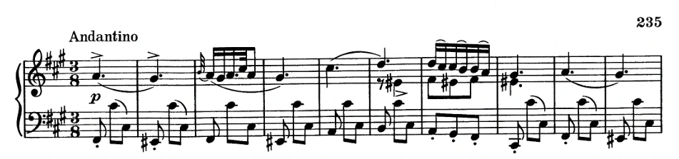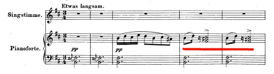 이러한 (약박에 붙은) 스타카토와 악센트의 조합은 역시 1828년에 작곡된 슈베르트의 제20번 피아노 소나타 D 959의 2악장 안단티노에서도 거듭 사용됩니다.