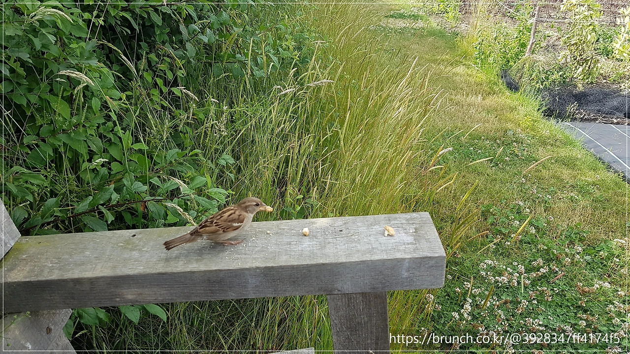 우리가 앉은 의자 옆으로 참새가 와서 친구가 되어 주었습니다. 물론 그 친구에게 가지고간 간식을 조금 나눠주었구요.