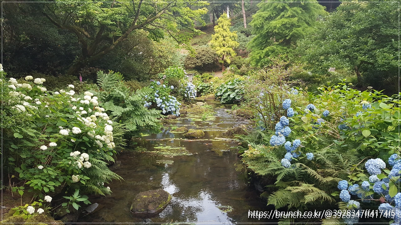 계곡 깊숙이 들어서자 시원한 물소리가 들려왔습니다. 그리고 그 물길을 따라 끝도 없이 펼쳐진 수국(Hydrangea) 무리가 우리를 맞이했습니다. 8월의 보드난트는 수국의 세상이었습니다. 누군가는 보드난트 가든의 백미는 '봄날의 노란 꽃비'를 말하지만, 저에게는 계곡의 서늘한 물안개 속에서 피어난 이 푸른 수국들의 생명력이 훨씬 더 강렬하게 다가왔습니다.