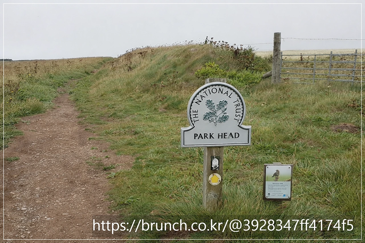 한참을 걸어 가다 보면, 언덕에서 해변으로 내려갈 수 있는 길들이 나타납니다. 아마도, Park head 근처였던 것 같습니다. 내셔널트러스트가 관리하는 곳들은 표식들이 지금 우리가 있는 곳을 보여줍니다.