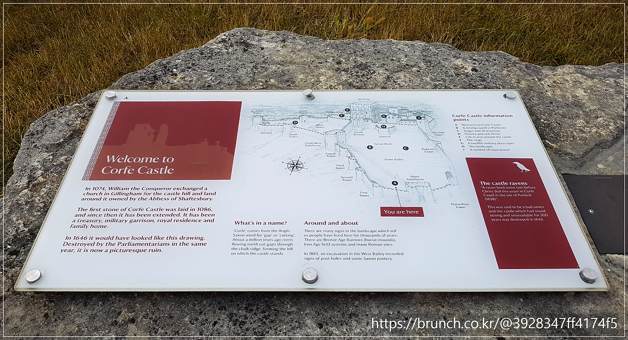구불구불한 언덕길을 넘자, 저 멀리 푸른 언덕 위에 이빨 빠진 거대한 회색 성벽이 모습을 드러냈습니다. '코프 캐슬(Corfe Castle)'이었습니다.
