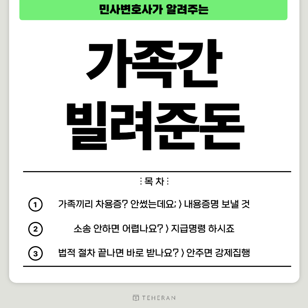 그래서 가족간 빌려준돈을 되찾을 때 강제집행까지 예상하고 진행하는 것이 좋습니다.
