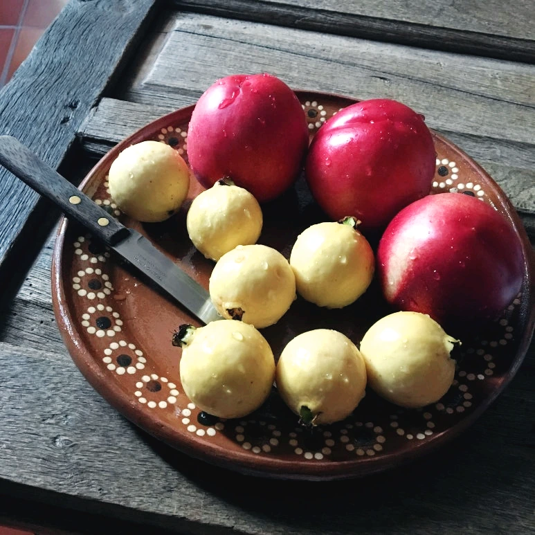또 아침이 찾아왔다. 오늘 아침의 후식은 구아바와 빠알간 복숭아.