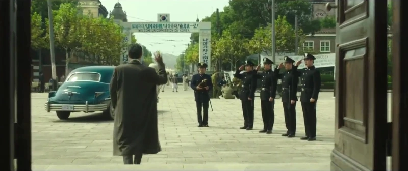 염석진이 1949년 반민특위 법정에서 무혐의로 풀려 나오는 장면입니다. 그가 경찰 고위 간부라는 것을 단번에 알 수 있습니다. 그가 거리에 나설 때 시위대가 거리를 행진하고 있었는데 그 시위대가 ‘북진 통일, 반민특위 해체’를 구호로 외칩니다. 실존 인물 ‘노덕술’은 반민특위 간부를 암살하라고 지시한 사실이 밝혀져 반민특위에 체포되지만 이승만 대통령에 의해 반민특위가 해체되고 풀려나 경찰 고위직으로 영전하고 이후 줄곧 대공 업무를 맡아 승승장구합니다. 제 버릇 개 못 준다고 그는 육군범죄수사단 대장자리에까지 오릅니다만 뇌물을 받아 파면되고 맙니다. 1960년에 국회의원 선거에 출마했다가 낙선한 경력도 갖고 있습니다.