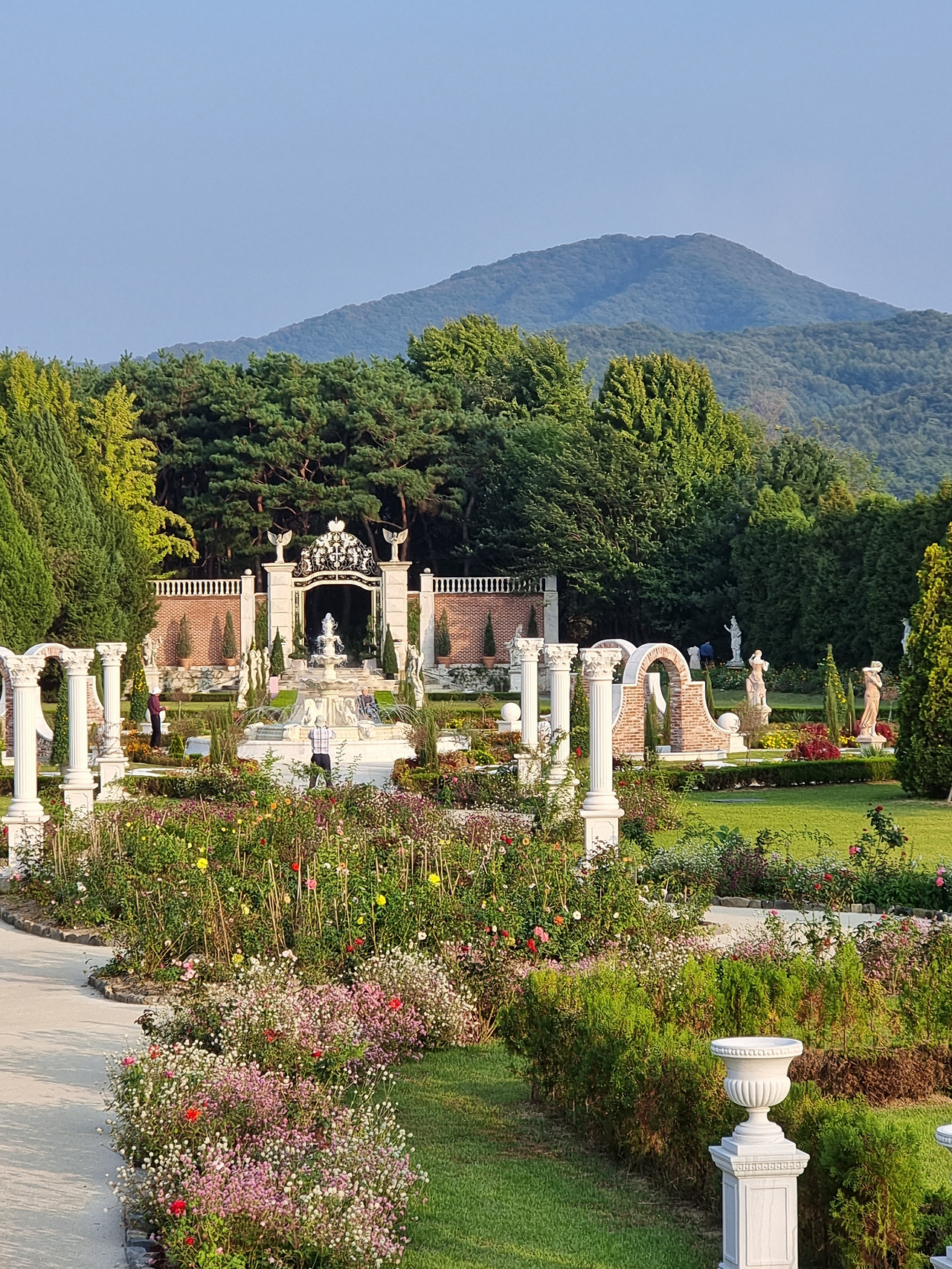 많은 생각과 기획이 이루어진 것 같은 이런저런 테마 산책로를 지나 들어선 곳은 넓은 유럽식 정원이다. 영국과 프랑스, 이탈리아의 정원이 함께 조성되어 있는 이곳도 조형물을 중심으로 아기자기하게 꽃들이 조성되어 있었다. 벽초지 수목원을 조성한 사람의 예술적 상상력이 여기저기에서 엿보이는 유럽식 정원이었다. 그래서 그런지 이곳에서는 드라마 촬영이 많이 이루어졌다고 한다. <궁>, <별에서 온 그대>, <미스터 선샤인>, 그리고 영화 <아가씨>도 여기에서 촬영되었다고 한다. 아마도 한 장소에서 다양한 시대와 문화 배경을 설정할 수 있고, 시대극부터 현대극까지의 장면을 다 찍을 수 있는 장소라 선택된 것 같다.