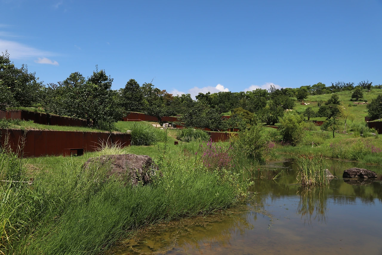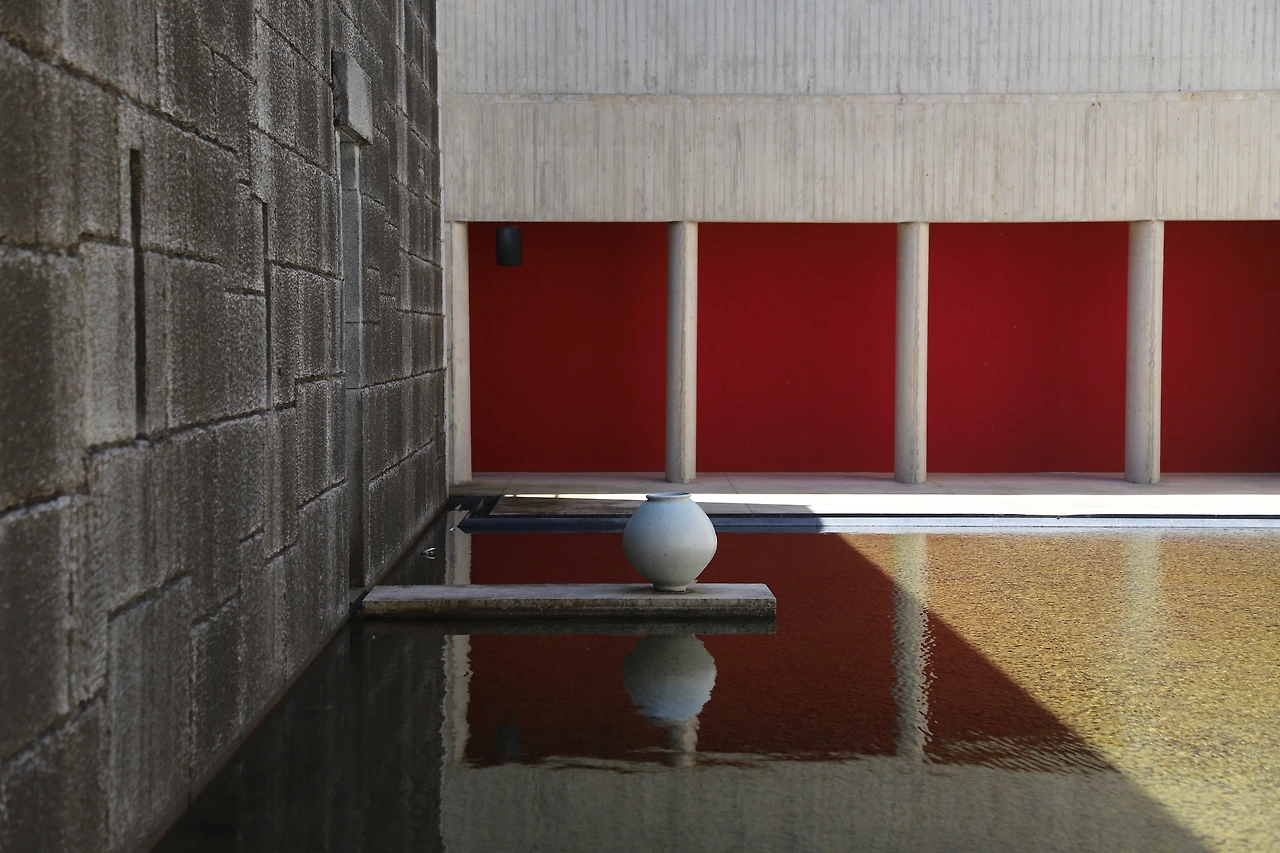 한 장소 한 장소마다 독특한 컨셉을 가지고 있어 다 멋지지만, 나에게 특별히 기억나는 곳을 기억을 더듬어 보자면 ‘명정’에서 조금 오래 머물렀던 것 같다. 승효상 건축가의 작품이라고 하는데 길게 이어지는 콘크리트 구조물 길과 잔잔한 연못 그리고 강렬한 빨간색 벽이 묘하게 조화를 이루고 있는데, 들어서는 순간 차분해지고 구석에 앉아 머리를 텅 비우게 만드는 매력을 가진 장소였다. 다음은 ‘와사’라는 철제 구조물도 인상적이었다. 자연스레 녹슨 것 같은 철제 구조물이 길게 놓여 있었는데 터널 같은 곳을 지나 만나는 초록 자연이 더 선명하게 마음에 들어오는 느낌을 받게 된다.